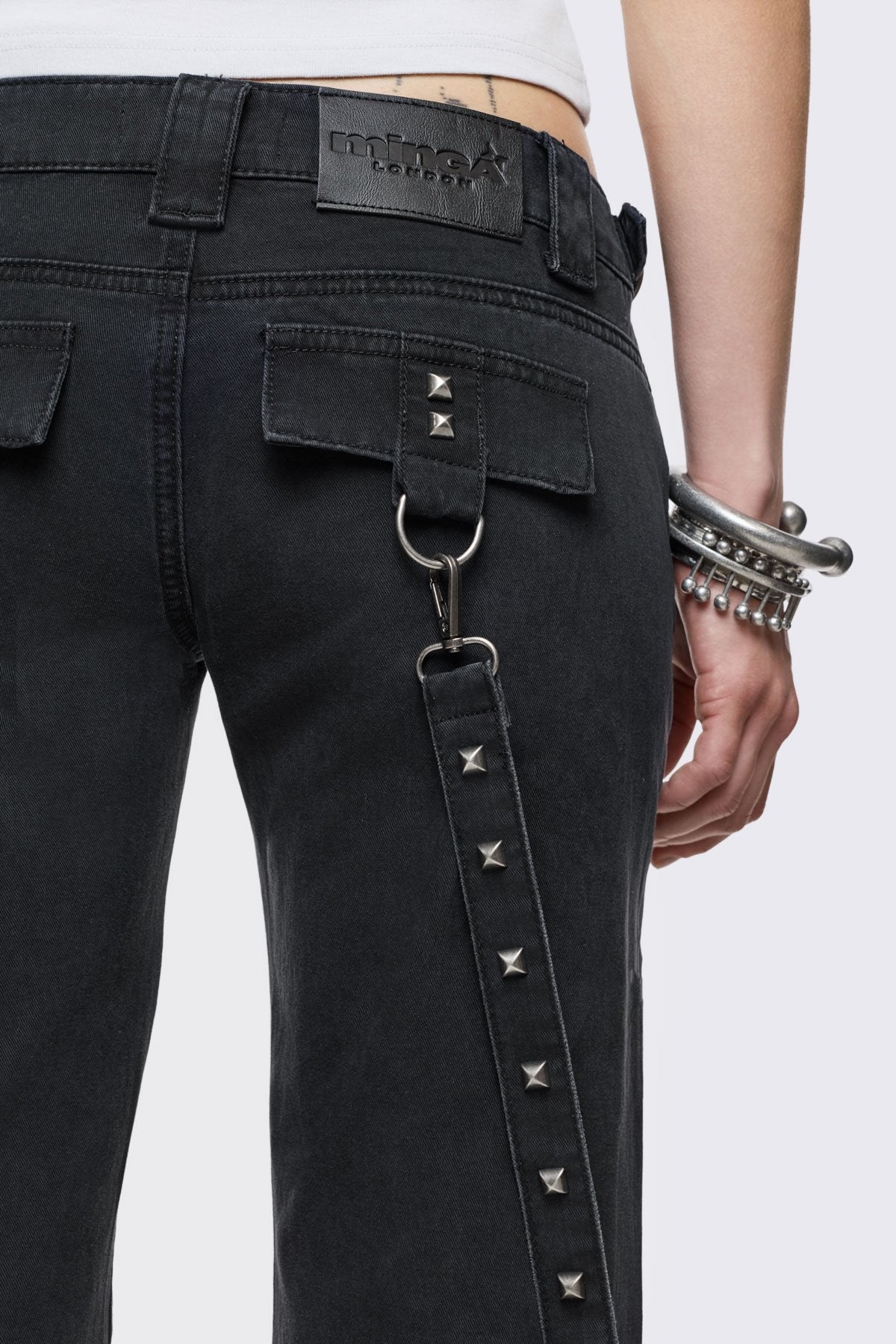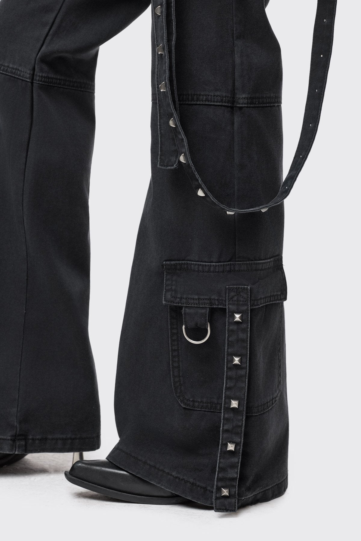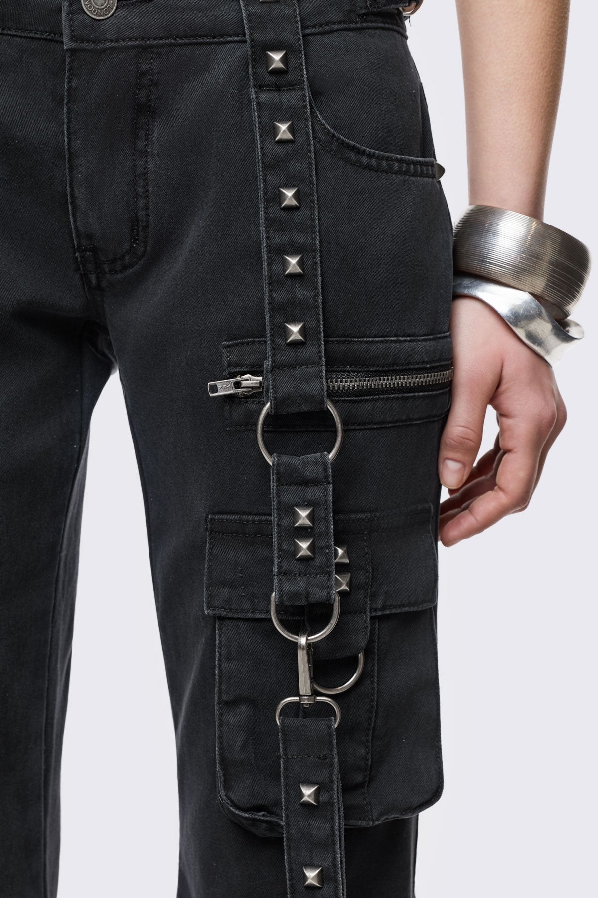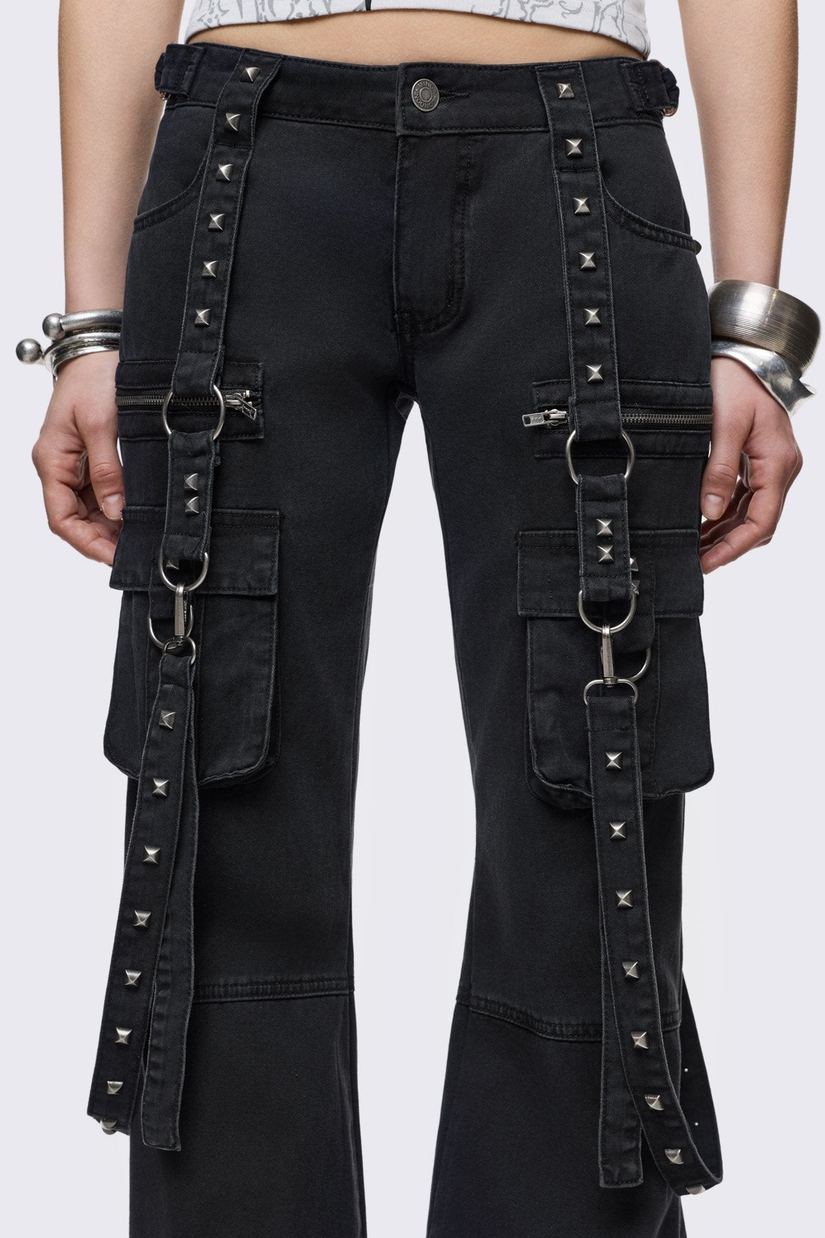 Black cotton cargo jeans with flared leg, studded straps, zip pockets and D-ring details in a goth Y2K style.