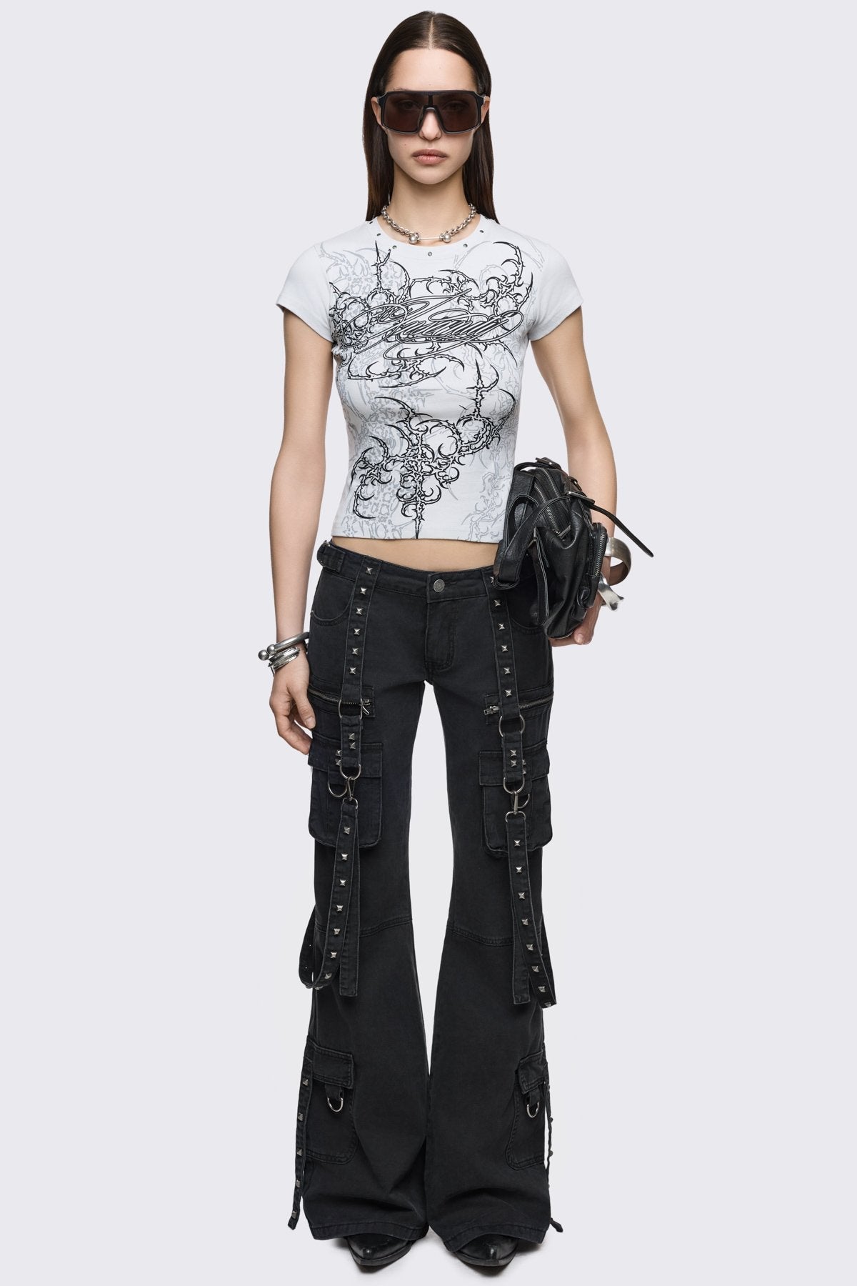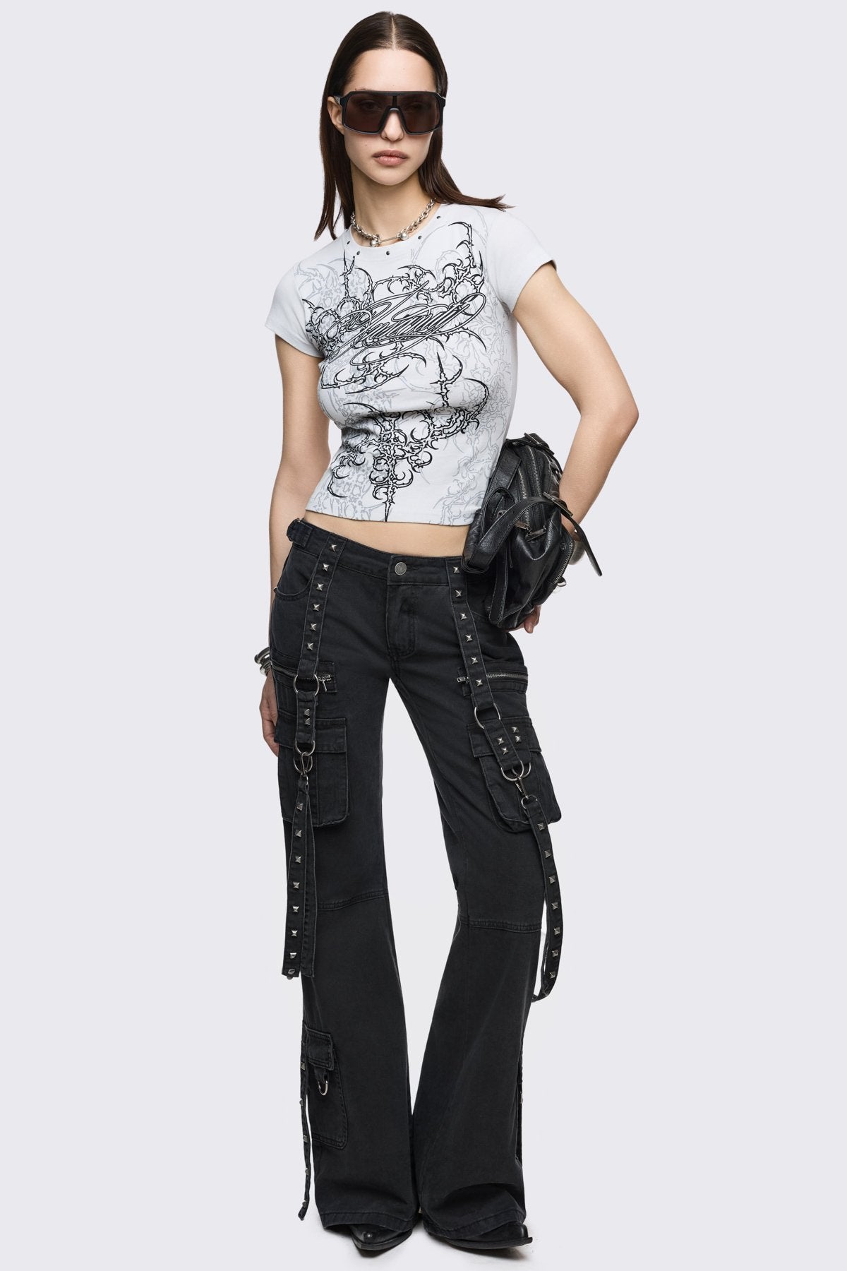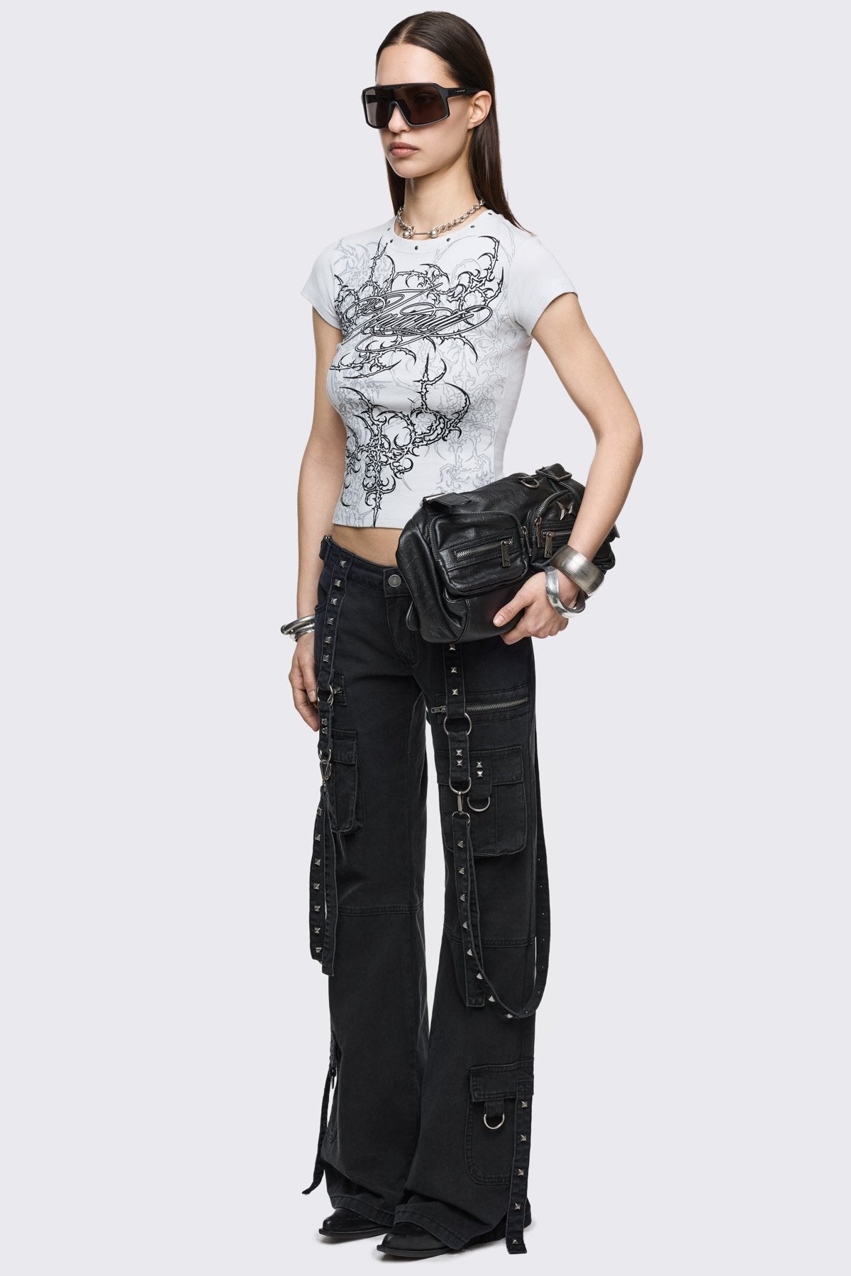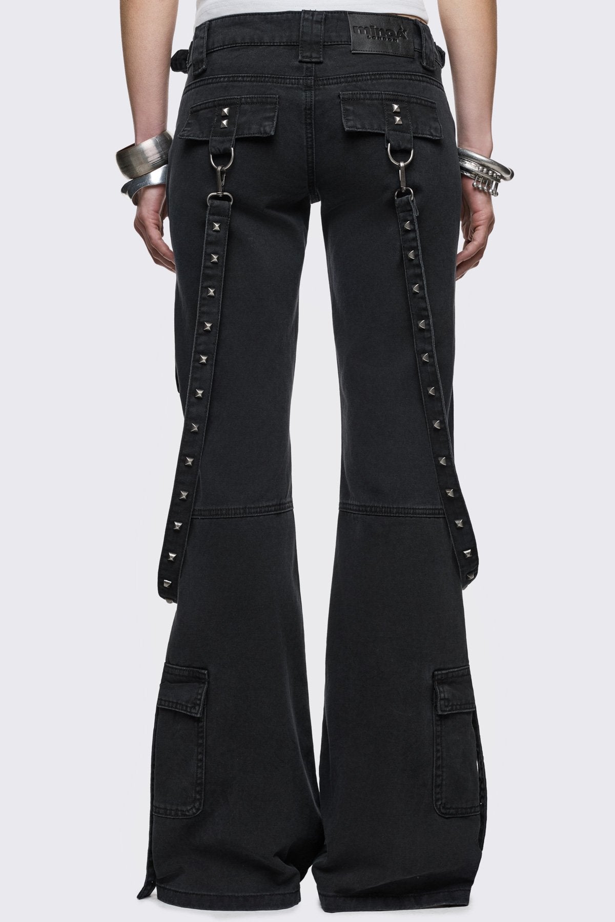 Black cotton cargo jeans with flared leg, studded straps, zip pockets and D-ring details in a goth Y2K style.