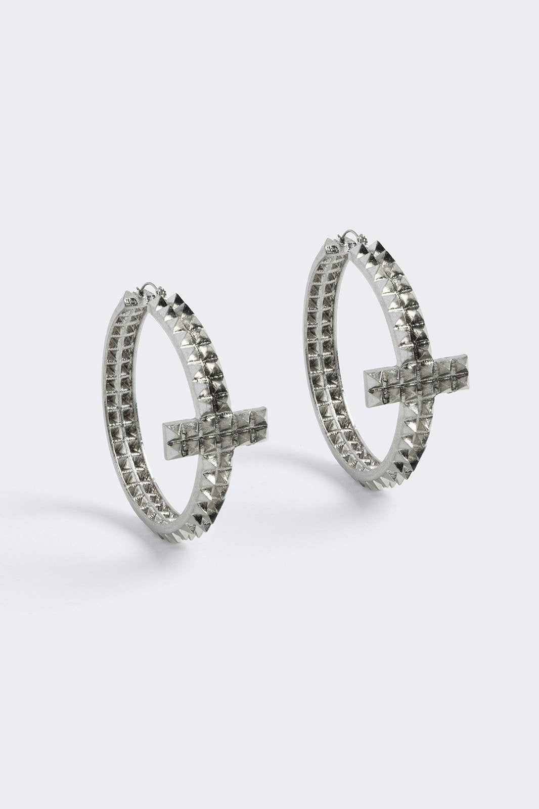 Silver chunky studded cross hoop earrings.