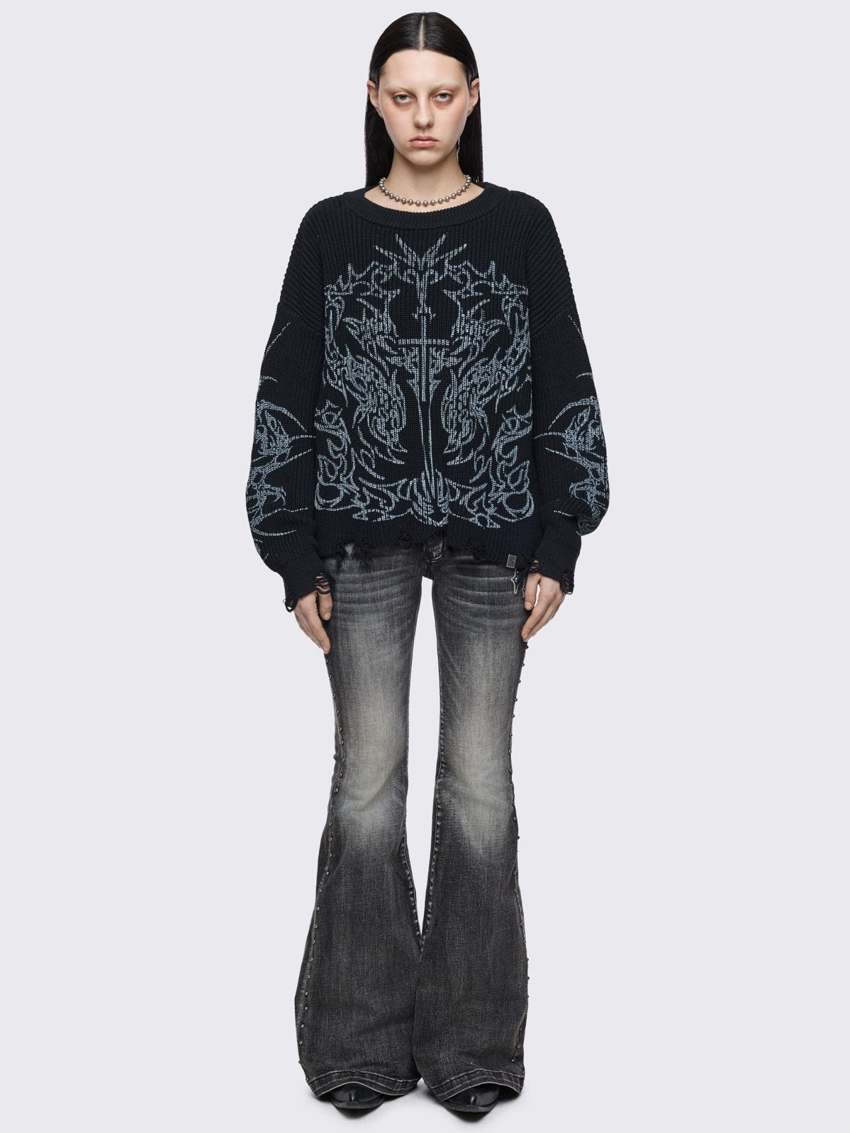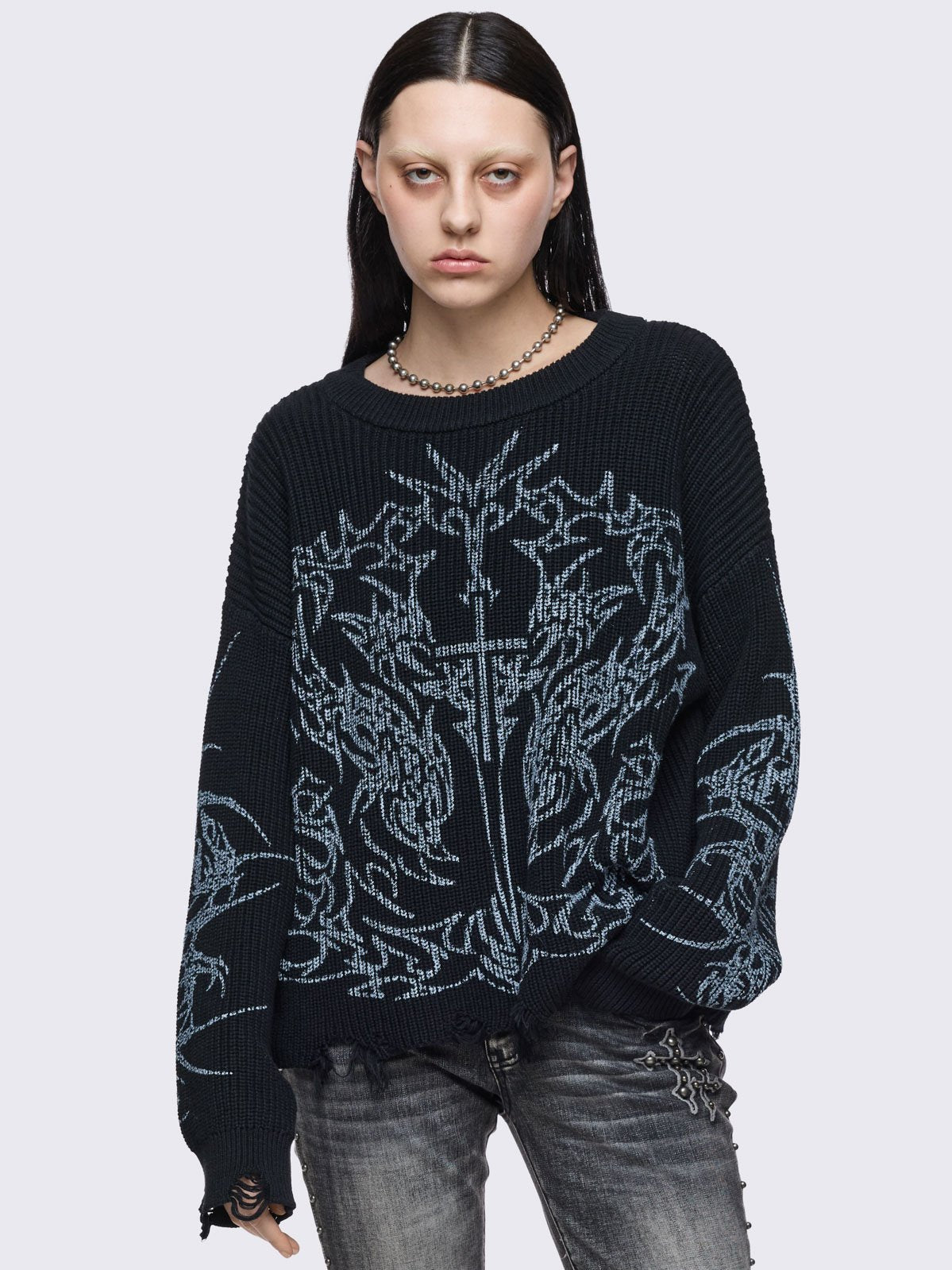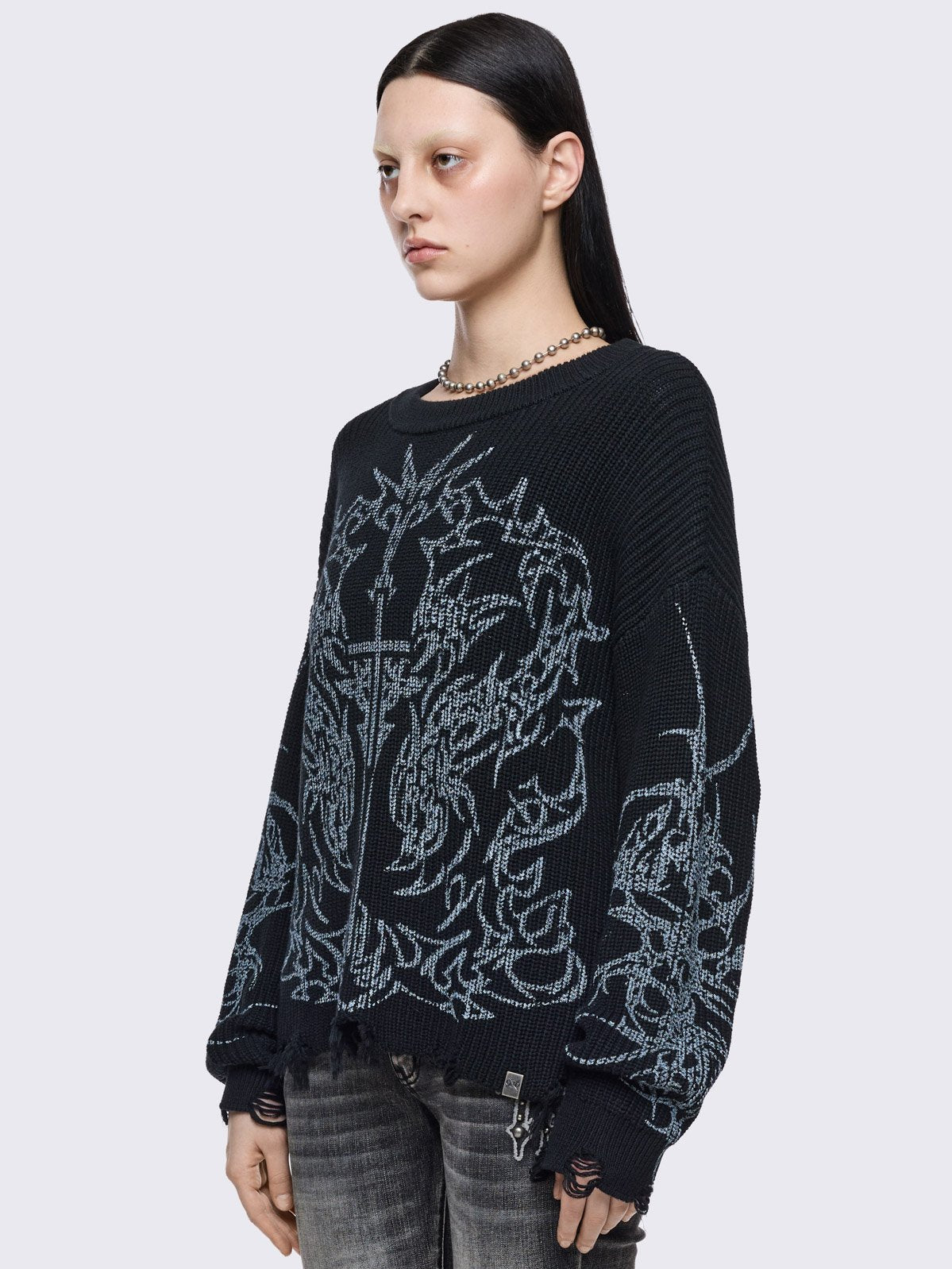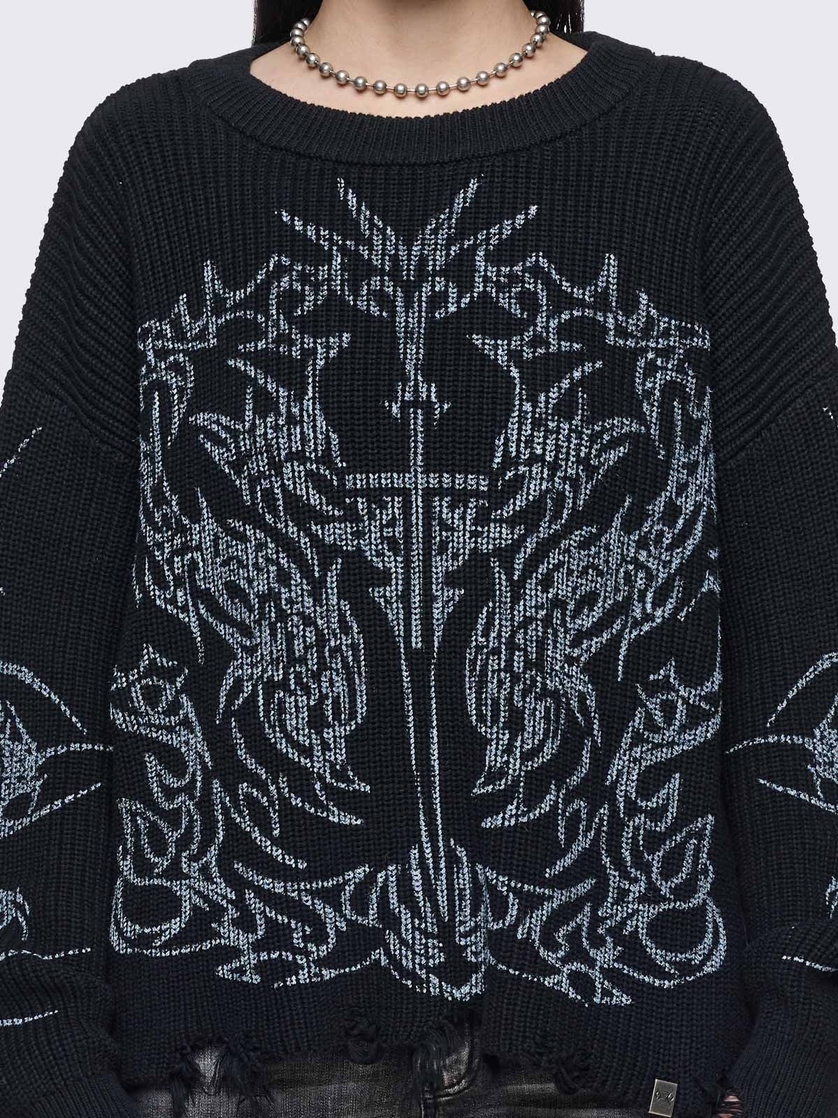 Black knitted jumper with cross sigilism graphic design and distressed rib