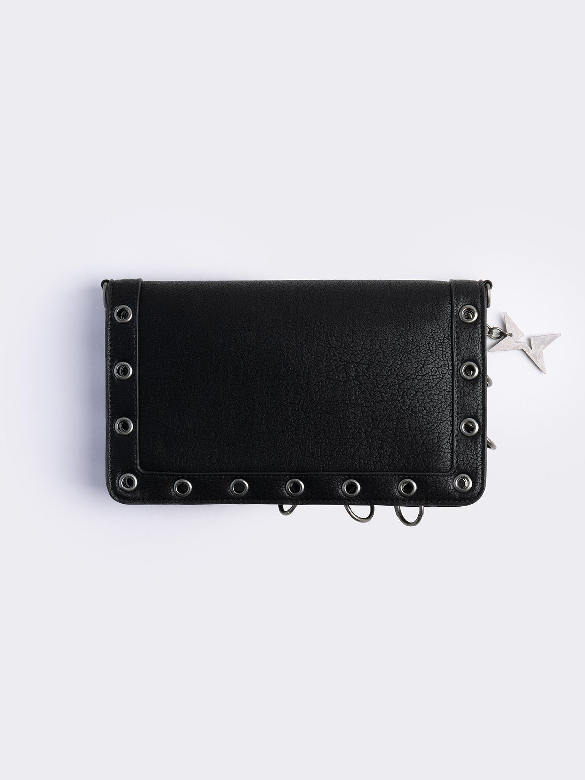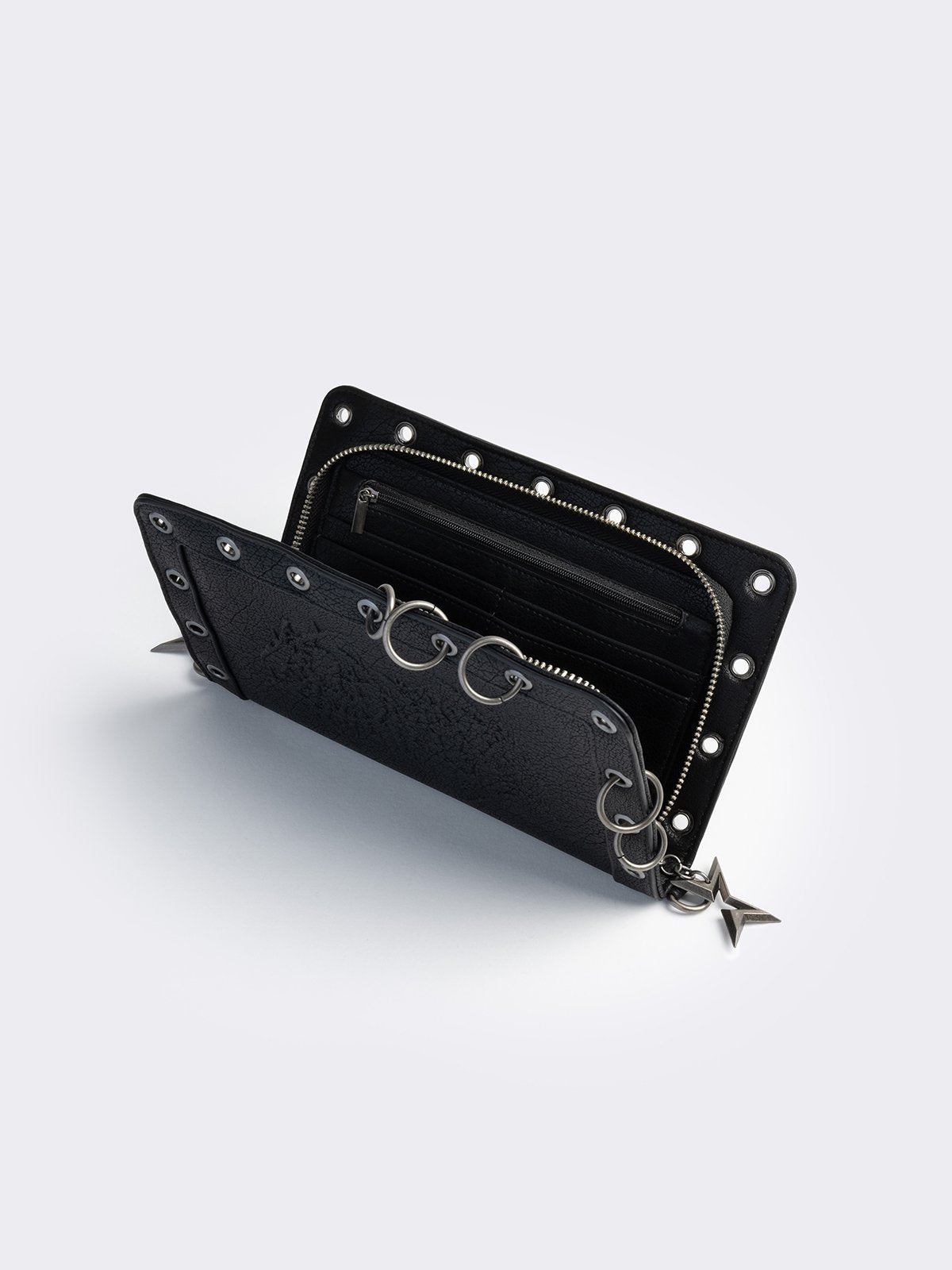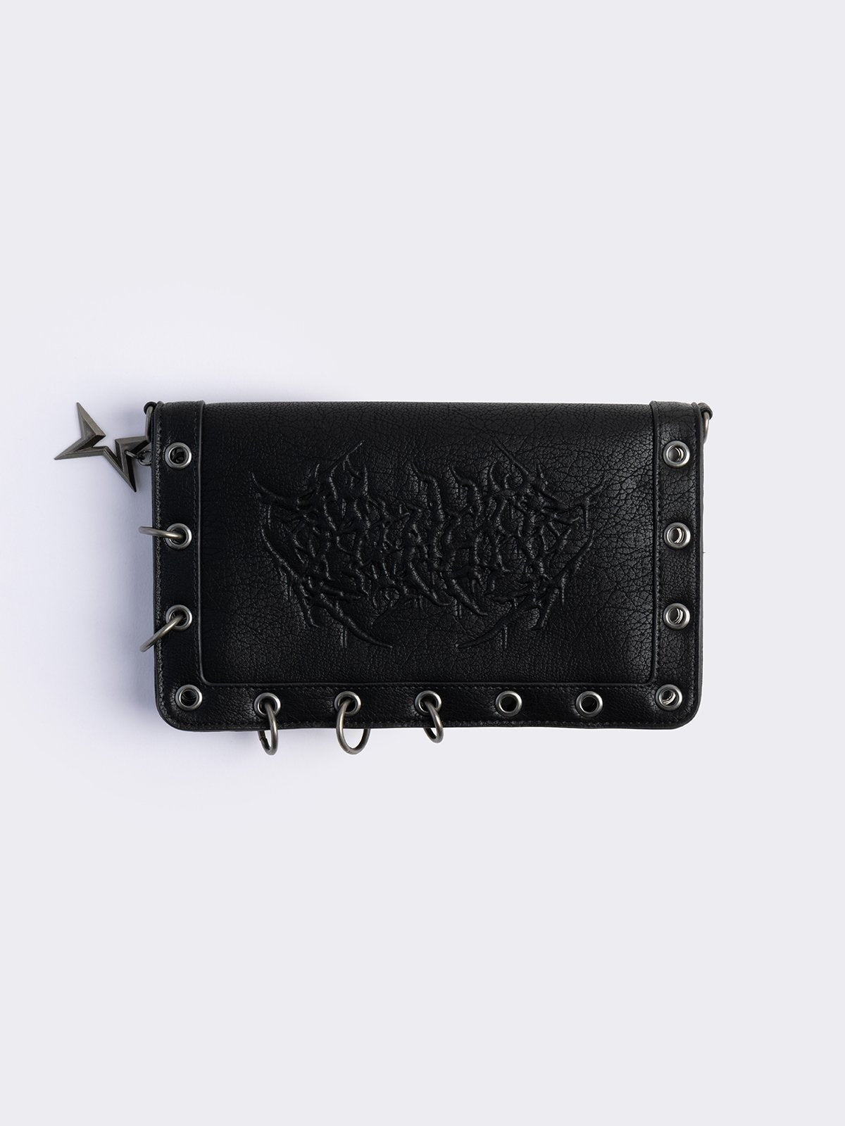Black faux leather wallet with sigilism embossed graphic and silver eyelet and O-ring details.