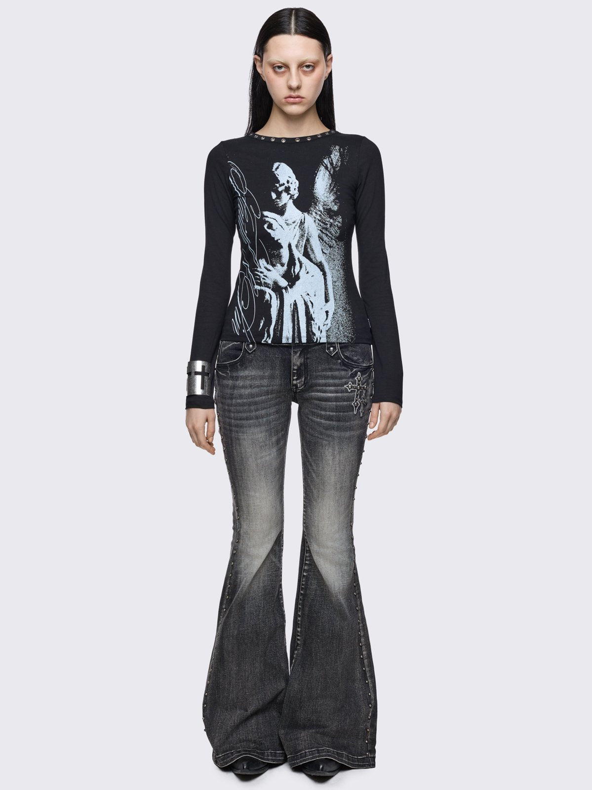 Black long sleeve top with white faith & sin graphic print