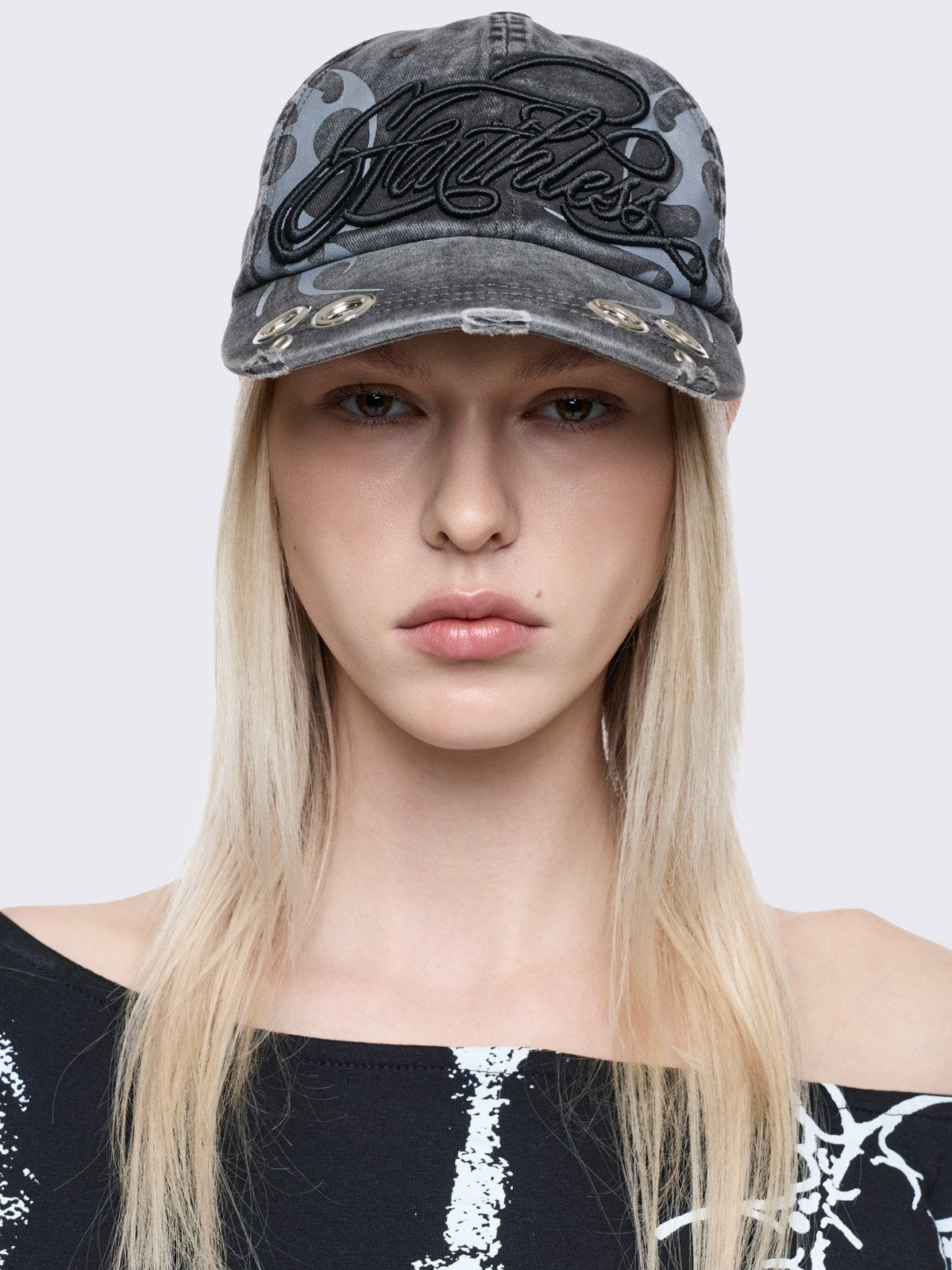 Grey washed denim distressed baseball cap