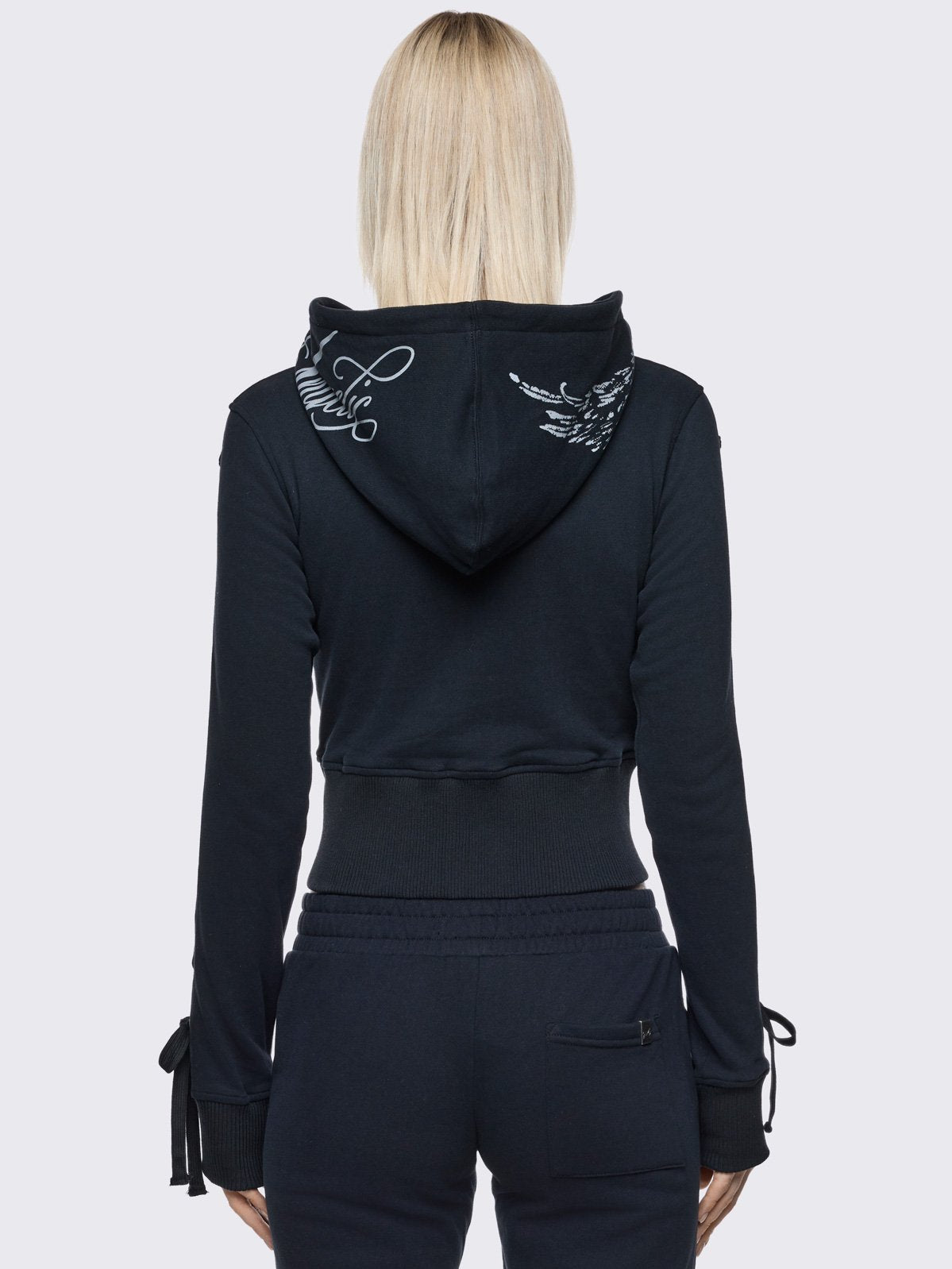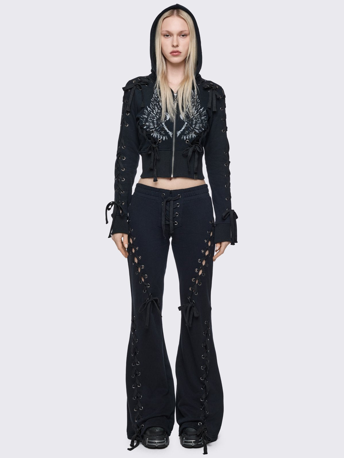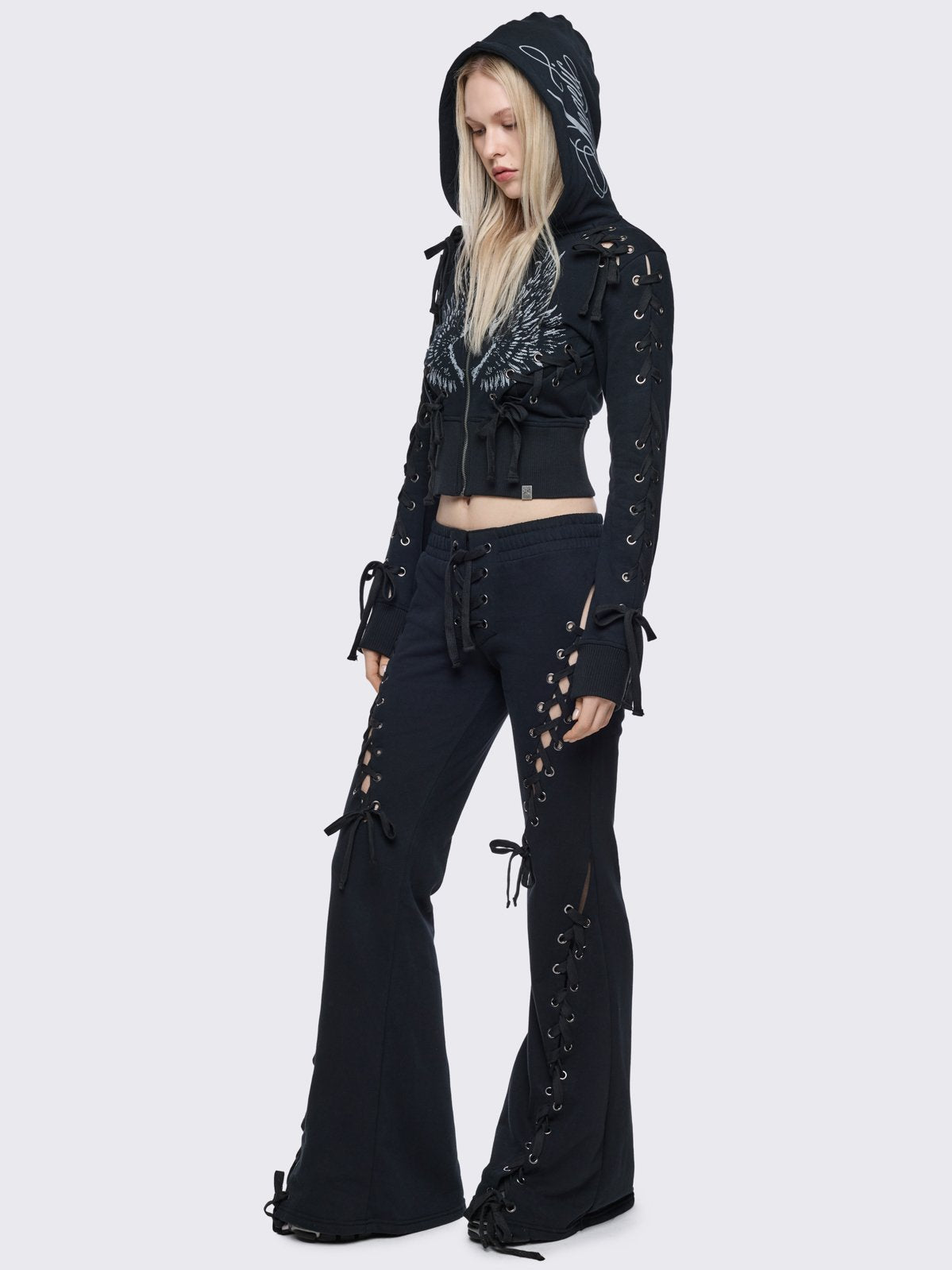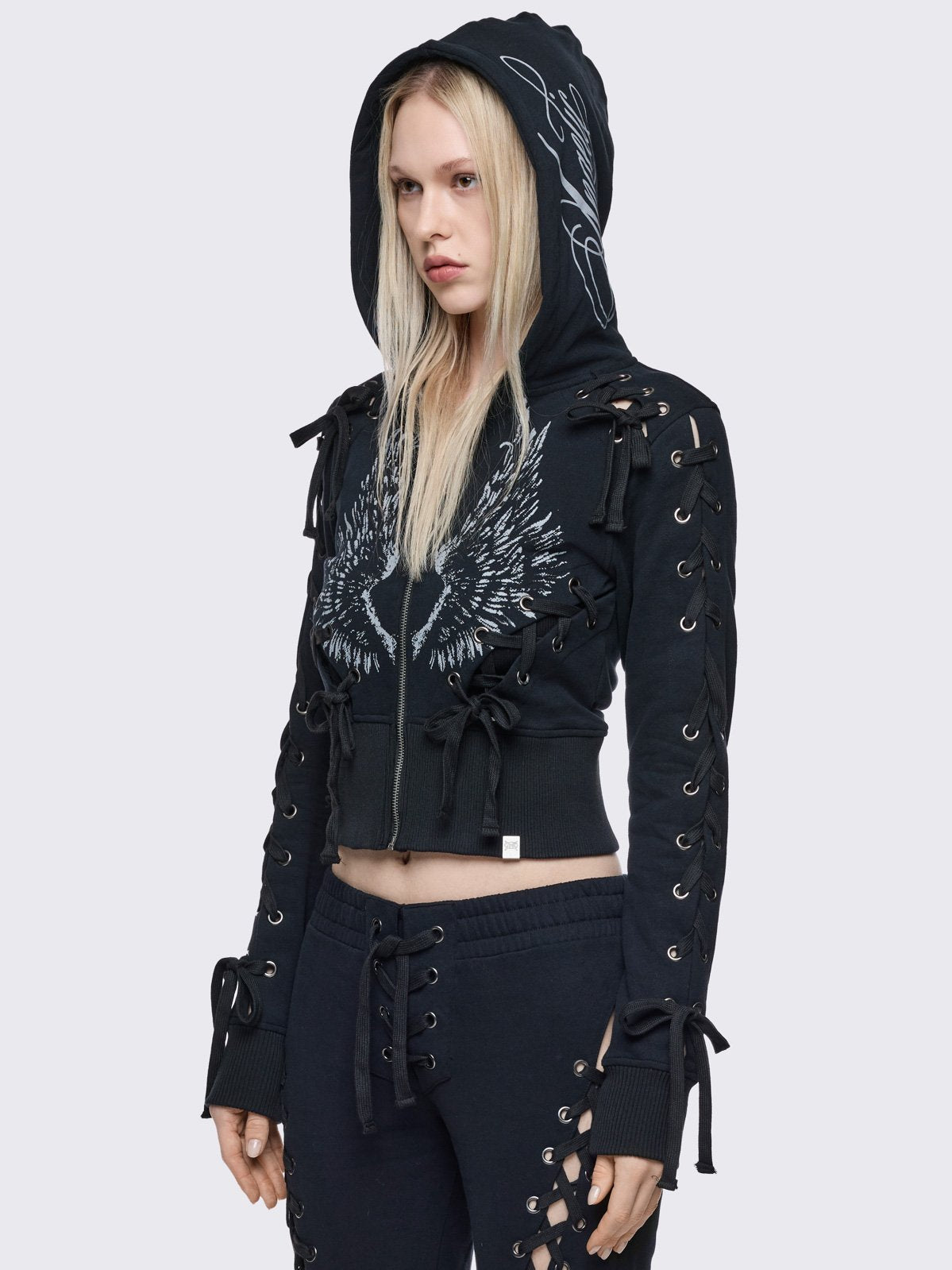 Black cropped zip up hoodie with open lace-up corset details down the sleeves and front and graphic print of wings on the front and hood