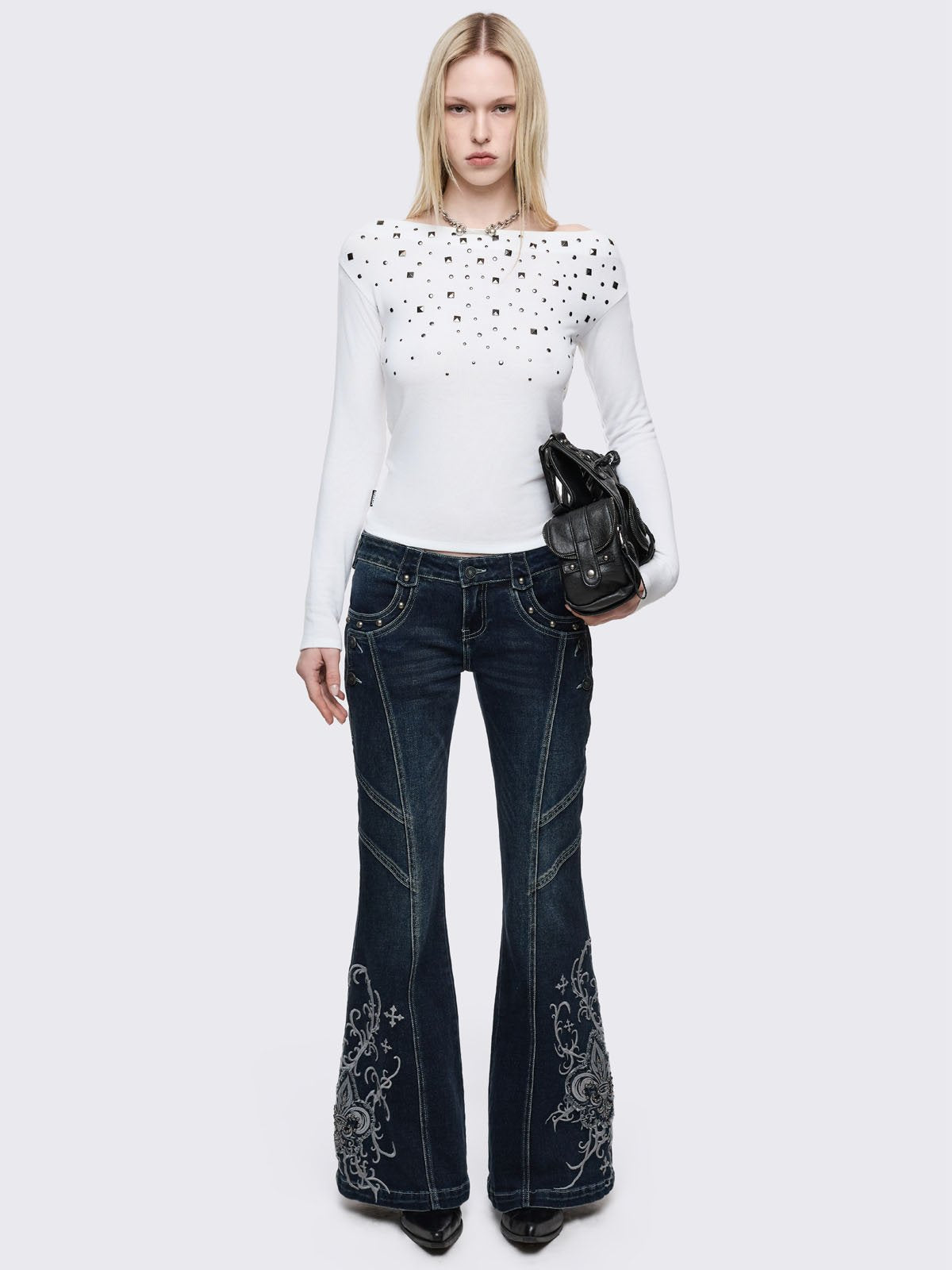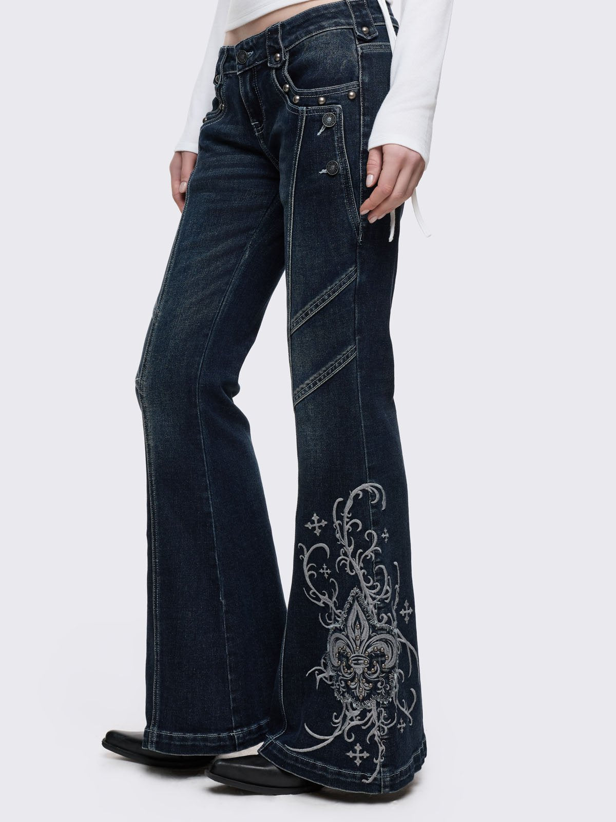 Dark blue wash flared jeans featuring gothic floral and fleur-de-lis embroidery on the lower legs and seams details.