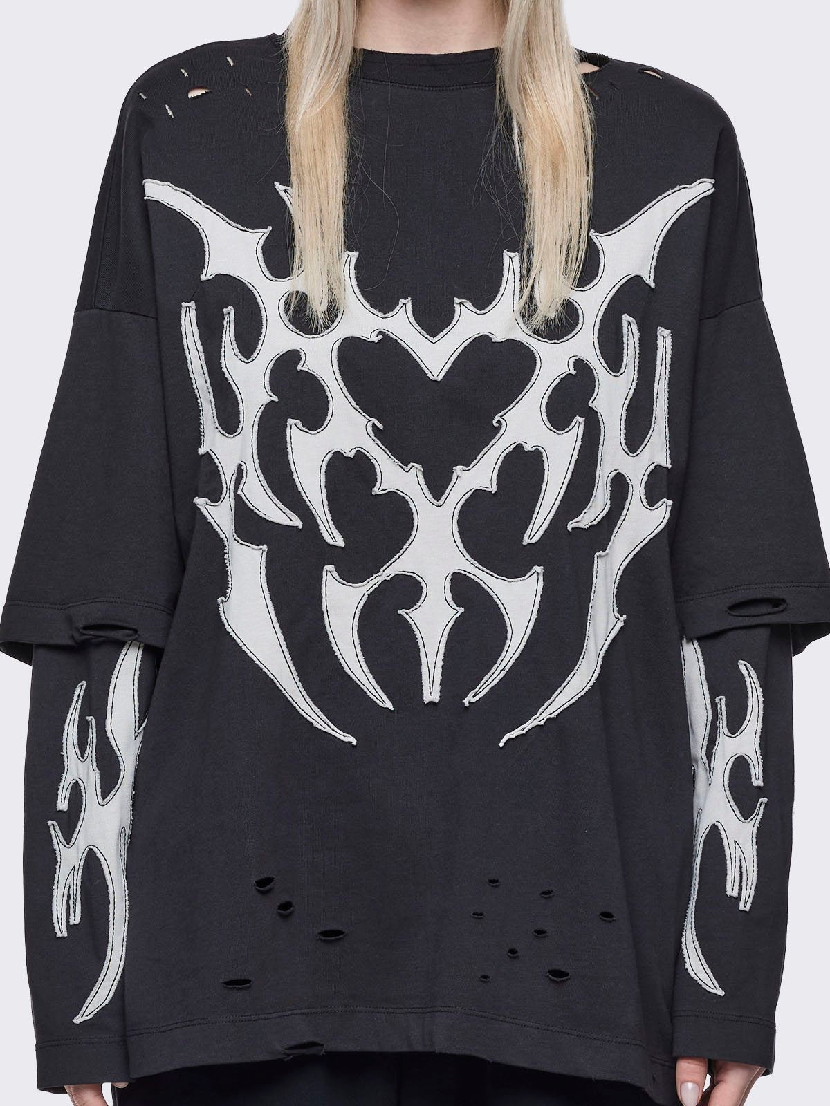 Black washed layered long sleeve t-shirt with heart and sigilism patches in light grey and distressed details