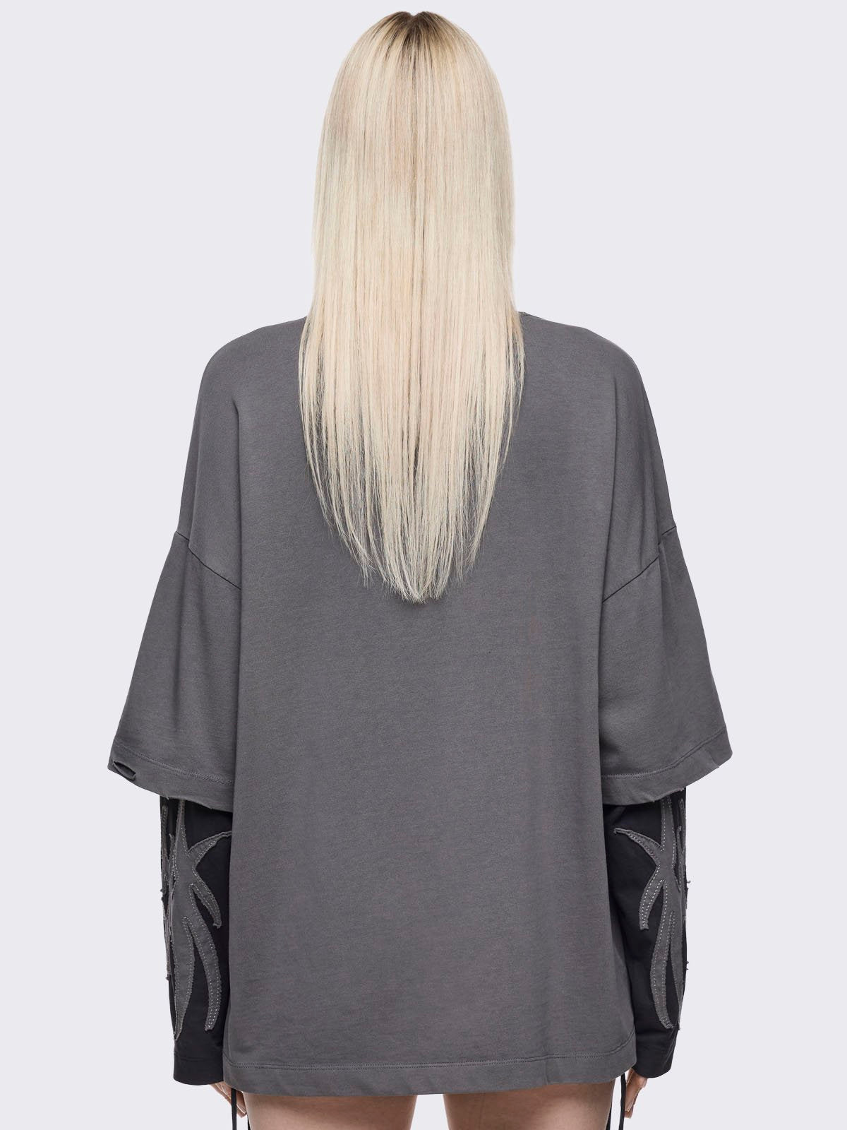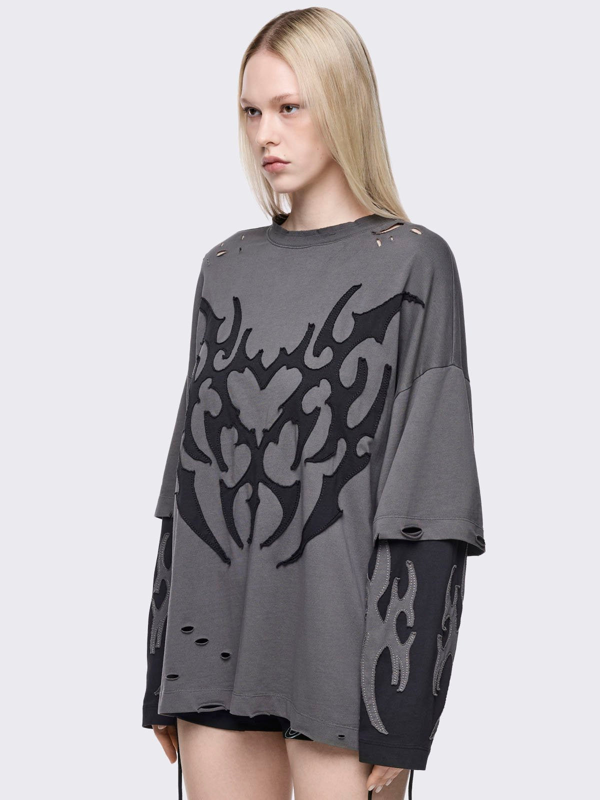 Grey distressed layered long sleeve t-shirt with heart and sigilism patches featuring contrast black sleeves.