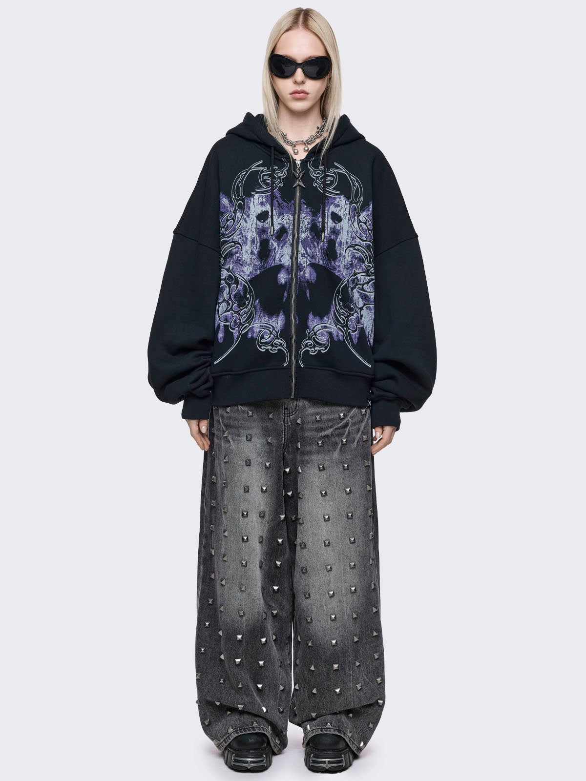 Black zip up oversized hoodie jacket with purple grunge graphic and sigilism print