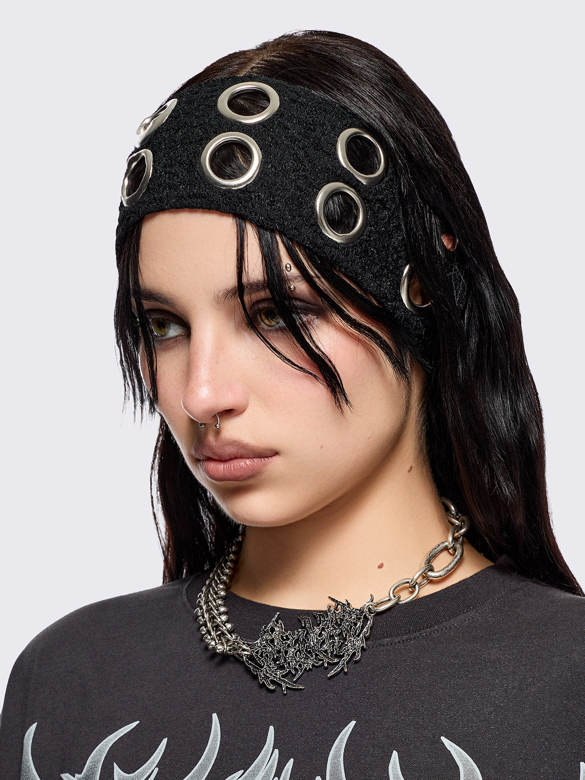 Grey wide headband with black kaomoji ASCII-style graphic embroidery.