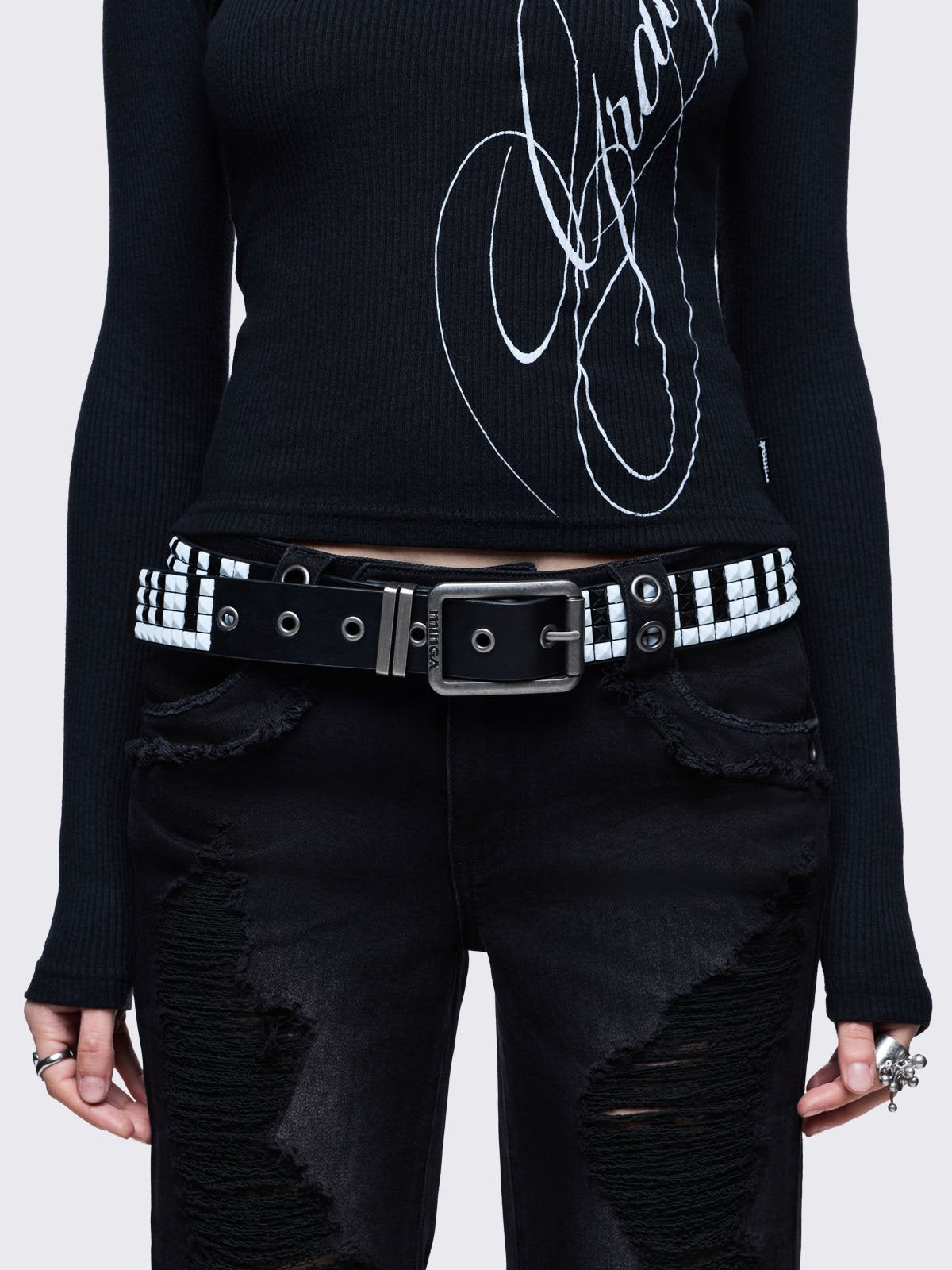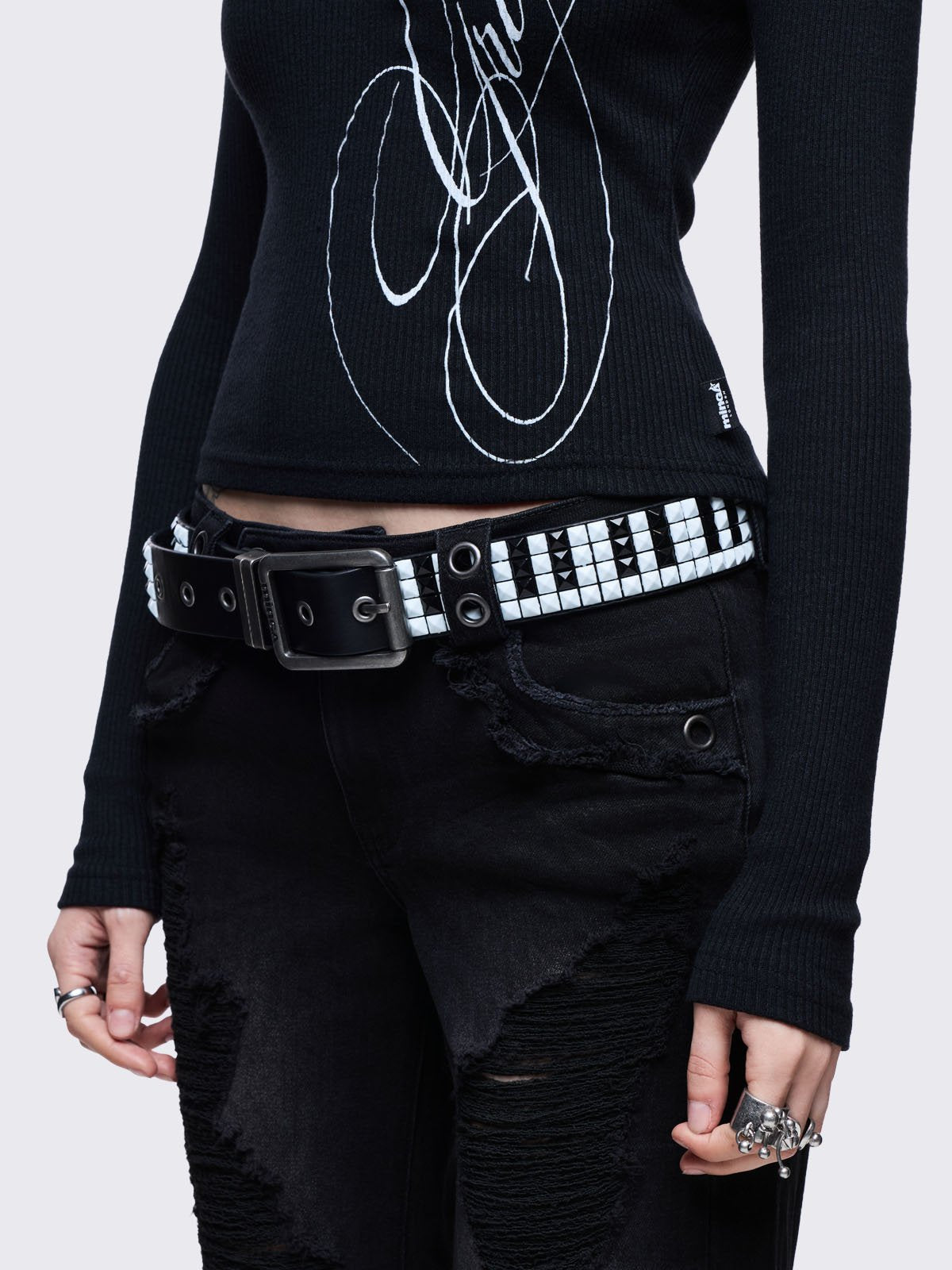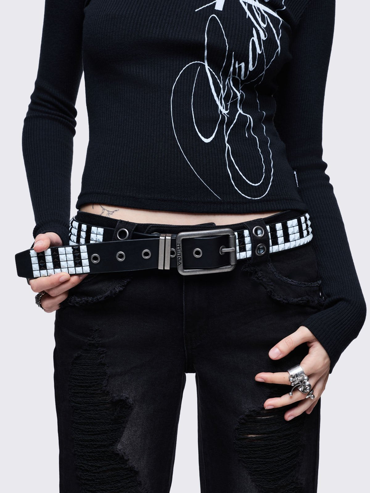 • Black and white studded buckle belt