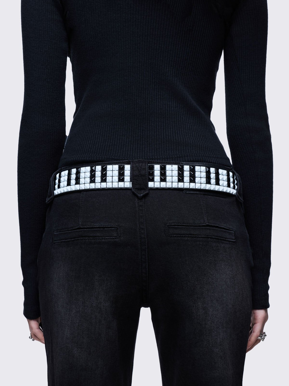 Black and white studded piano buckle belt