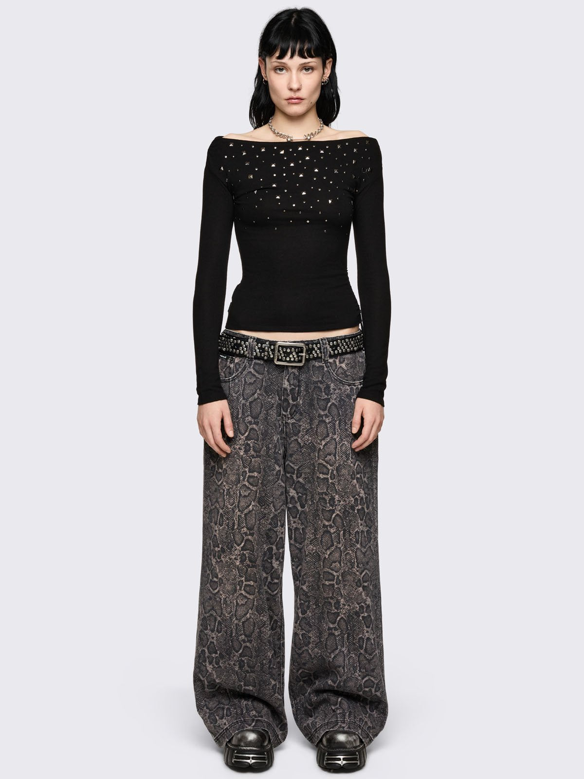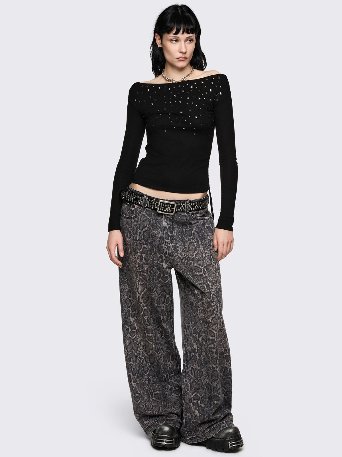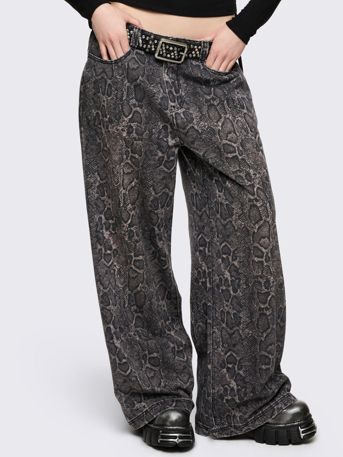 Baggy wide leg jeans with grey snake print.