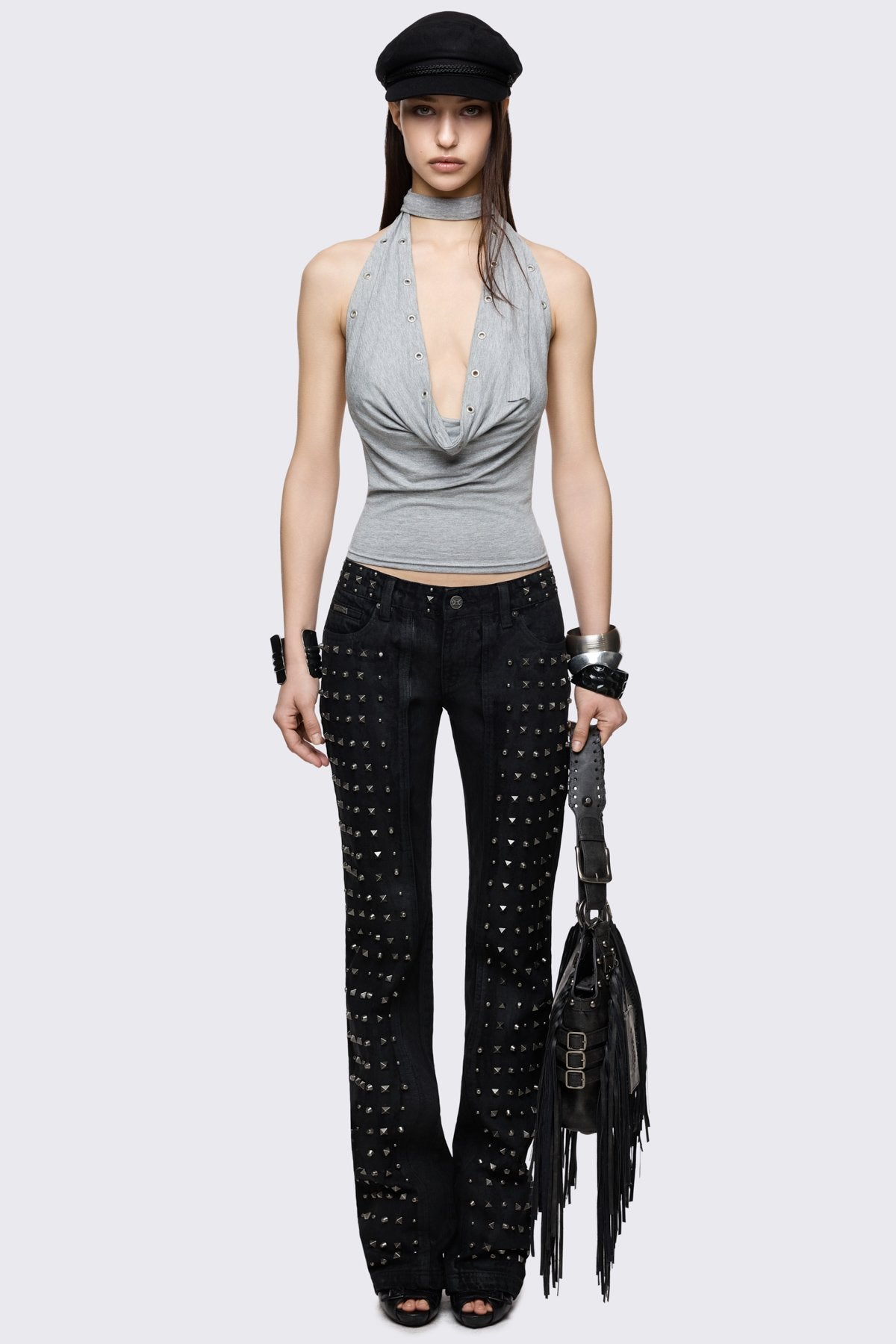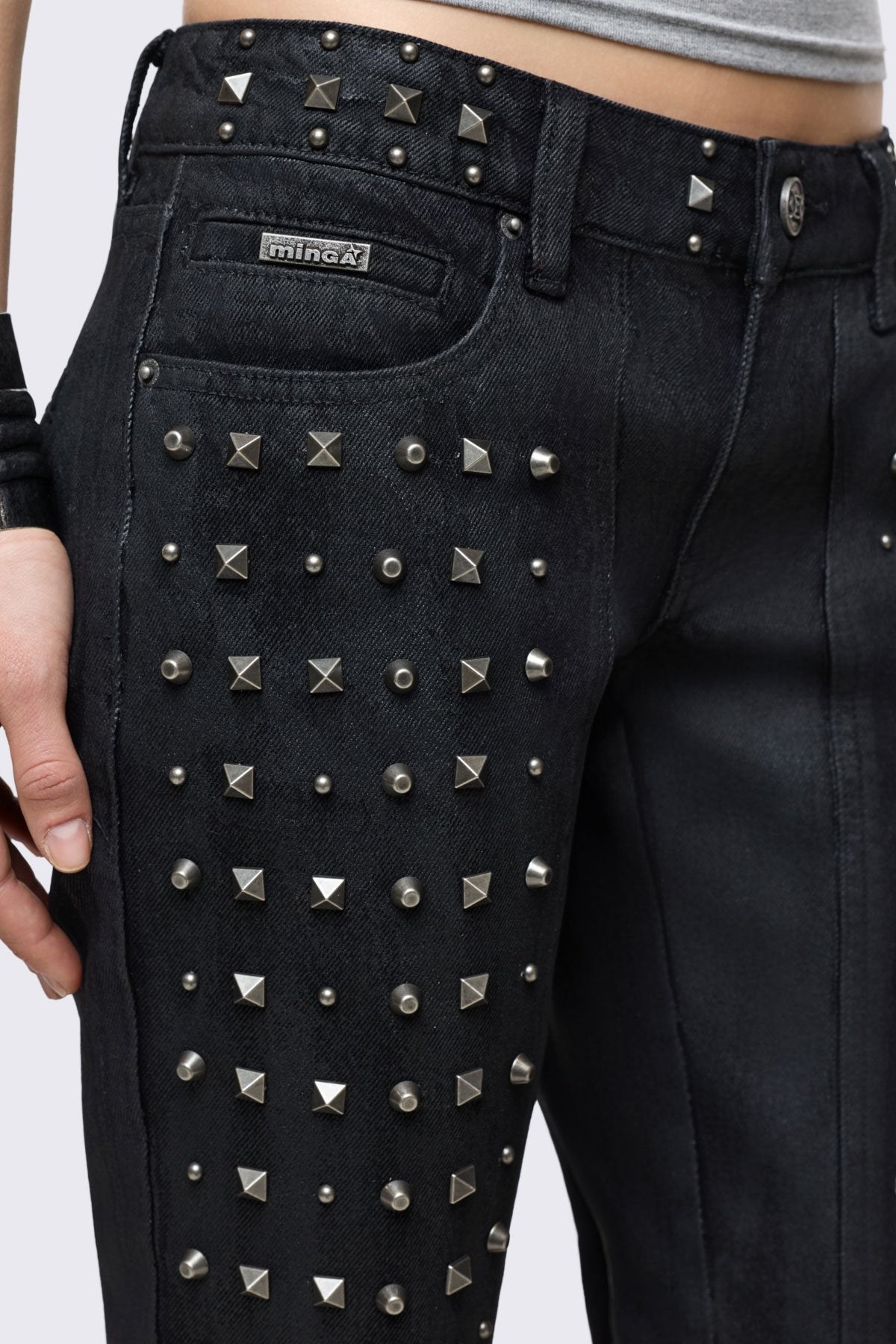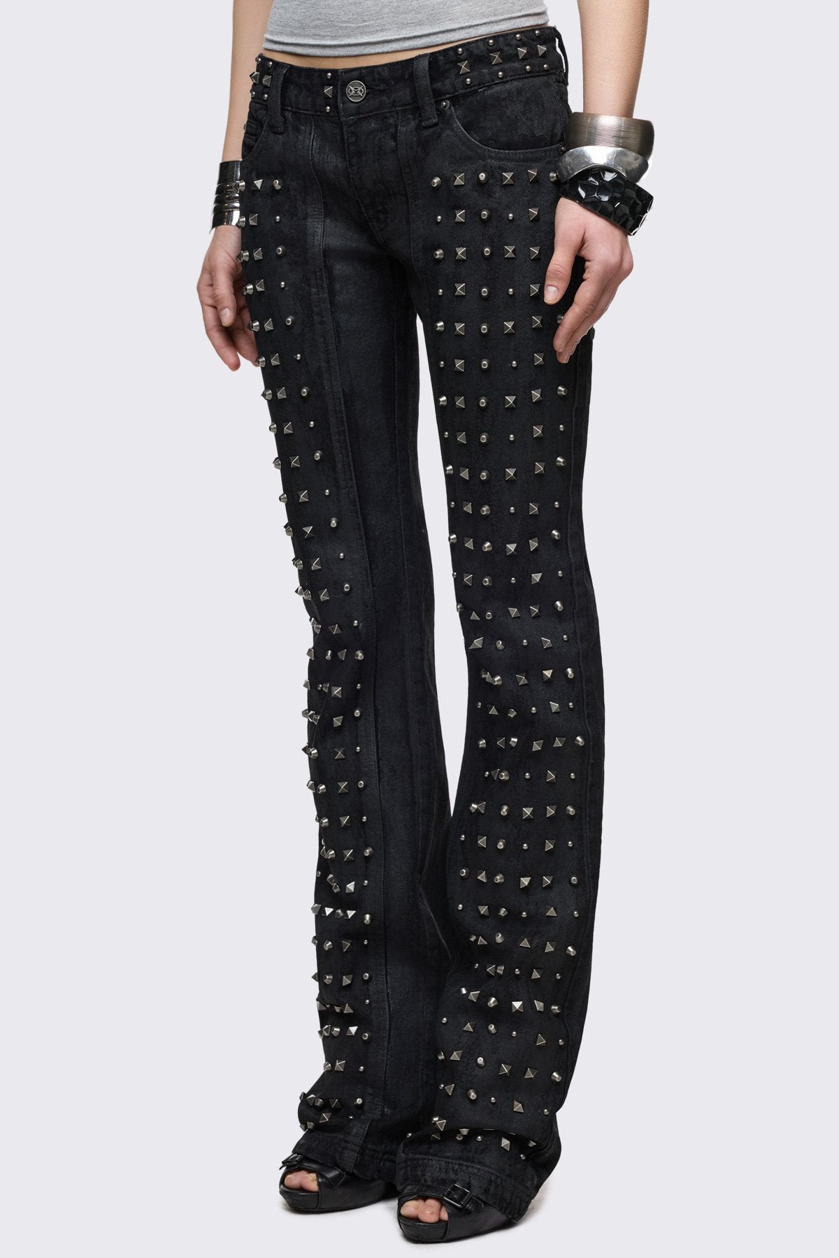 Black bootcut jeans in cotton blend with silver spikes and studded leg panels, low-rise grunge aesthetic.
