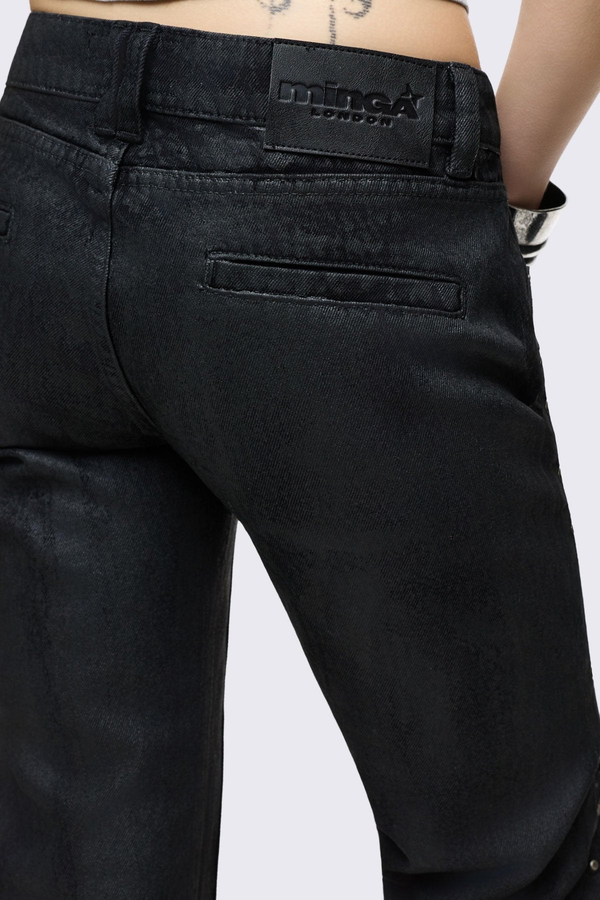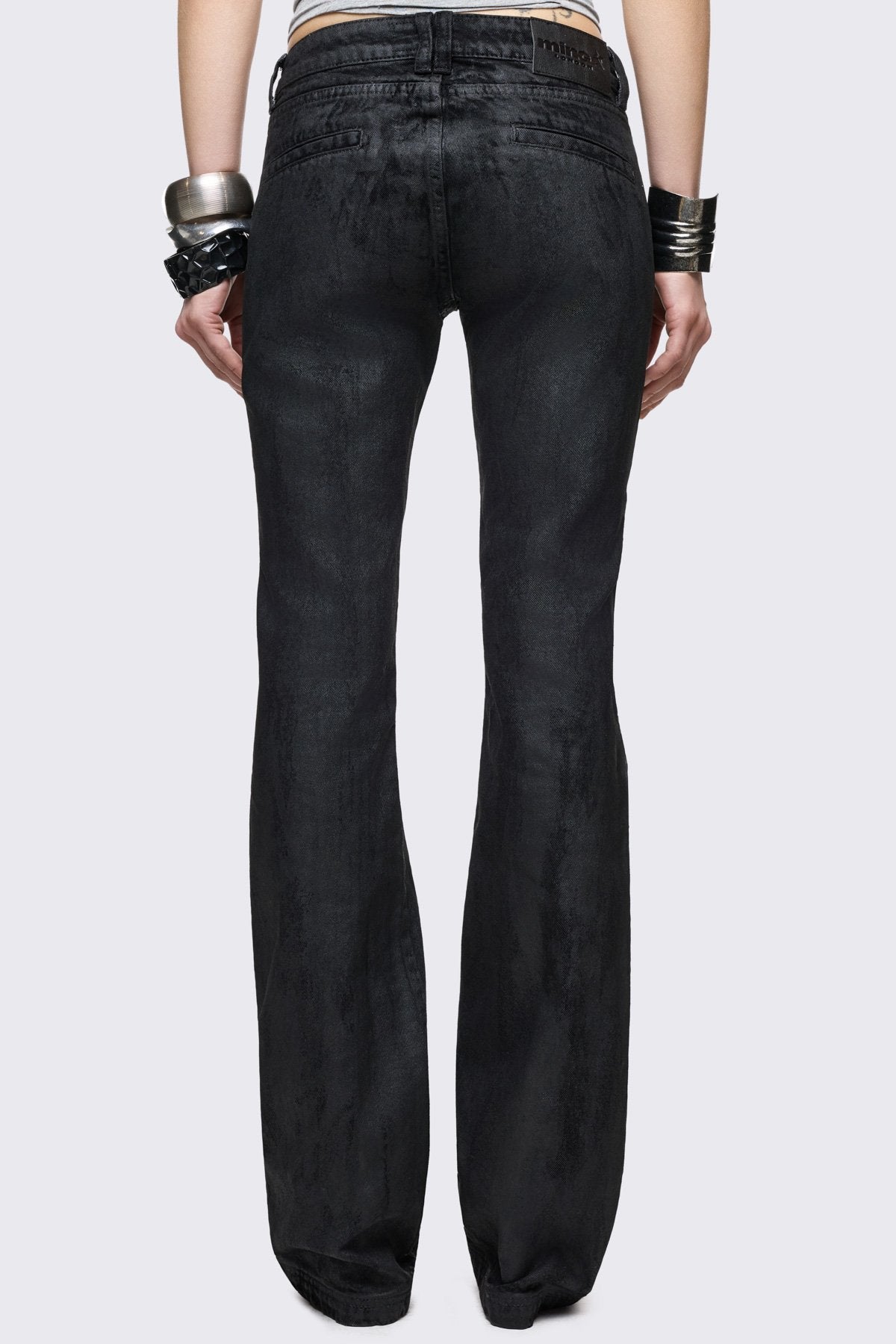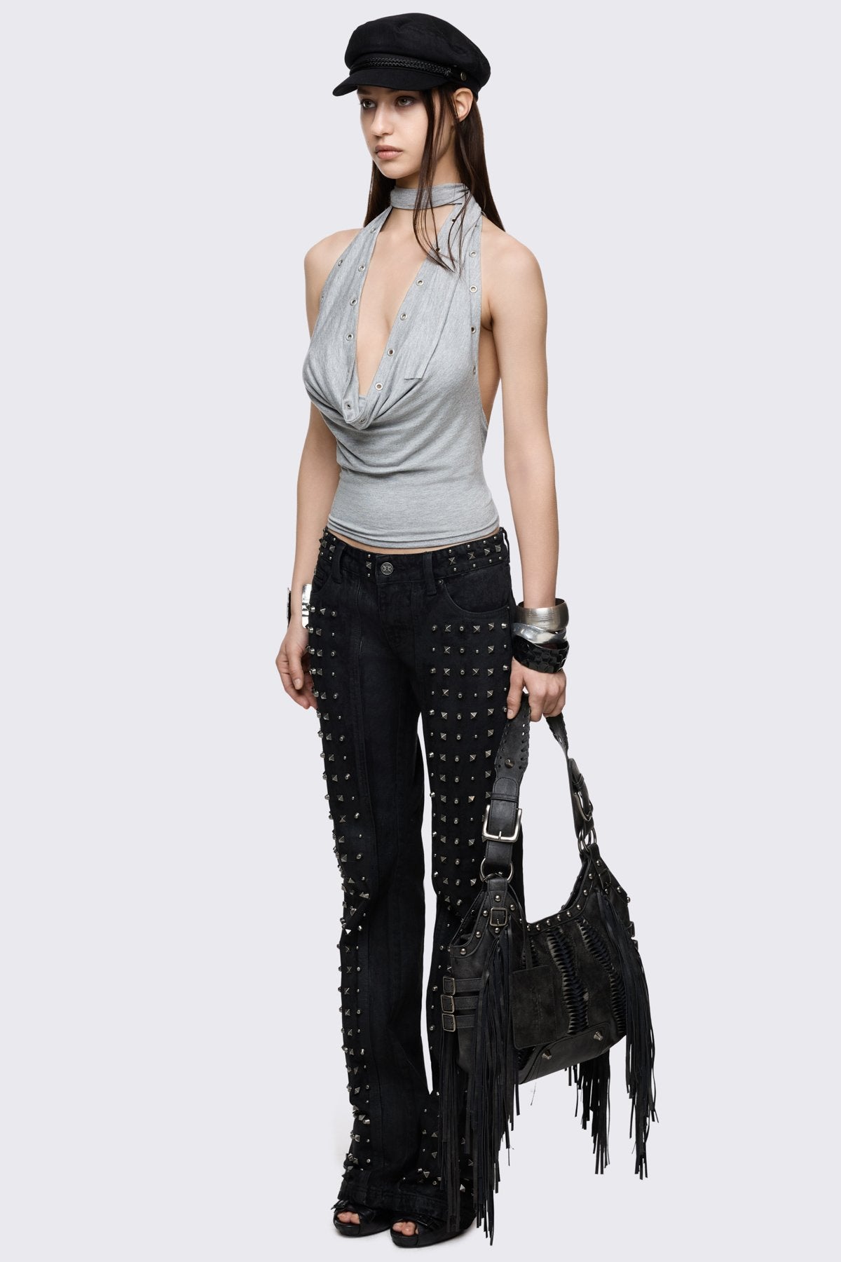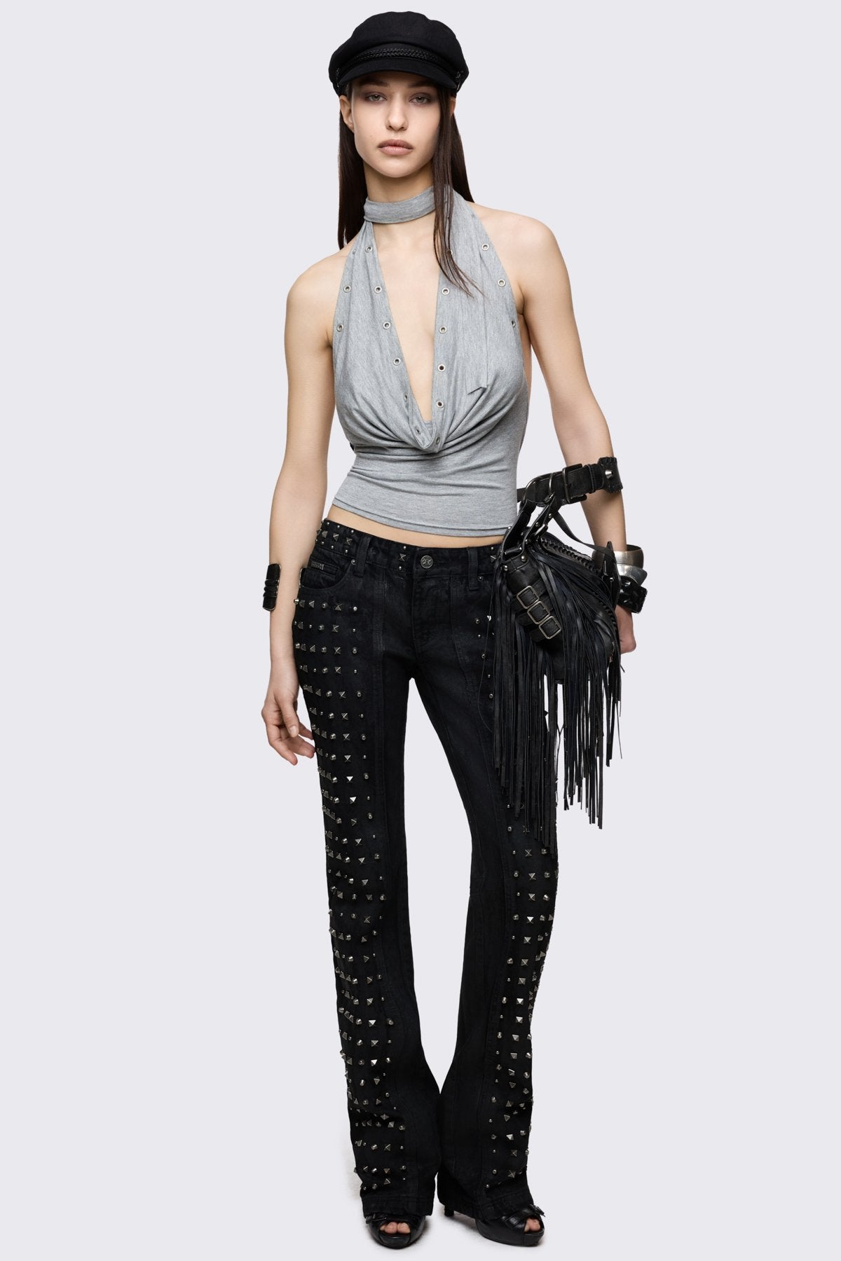 Black bootcut jeans in cotton blend with silver spikes and studded leg panels, low-rise grunge aesthetic.