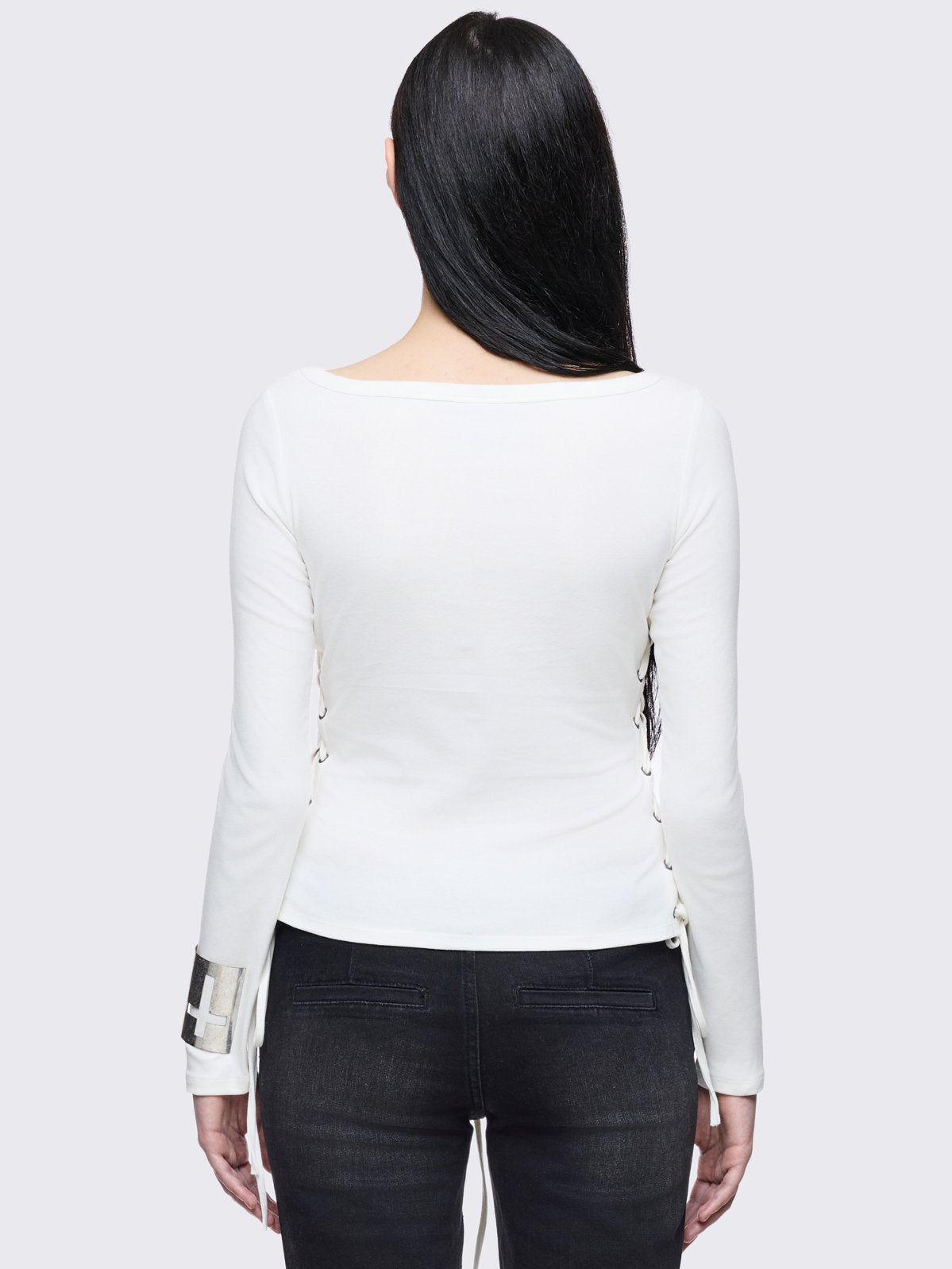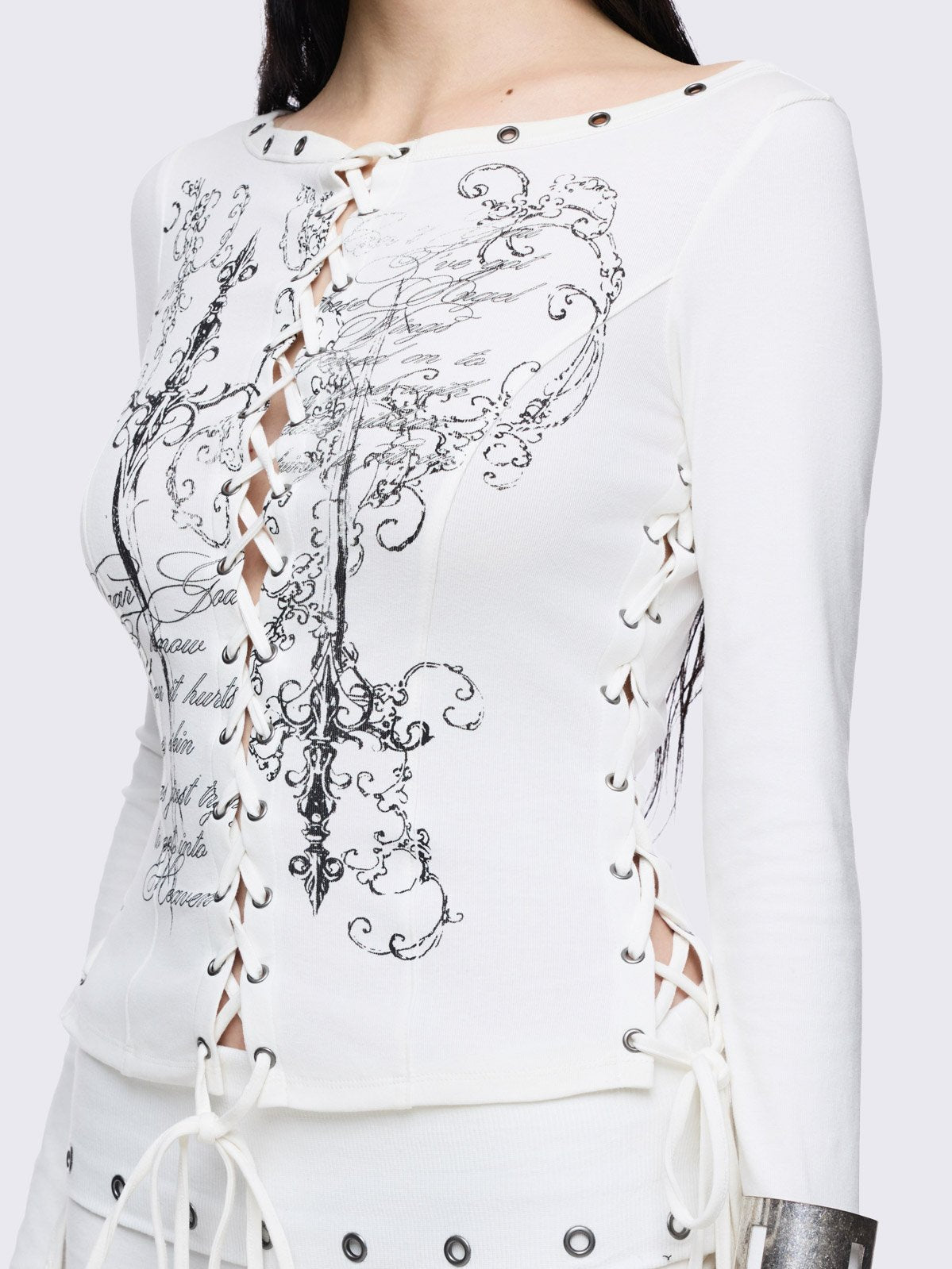 White long sleeve top with lace-up corset on front and sleeves featuring a daggers graphic front print
