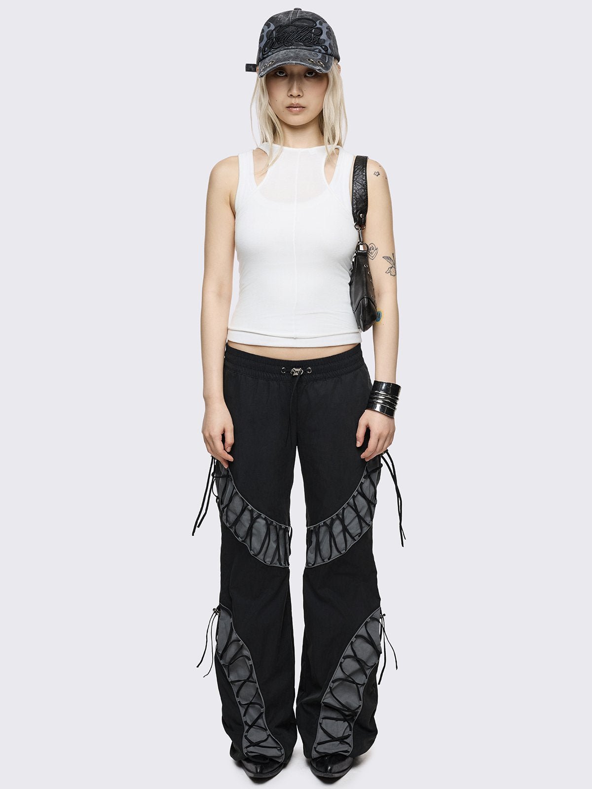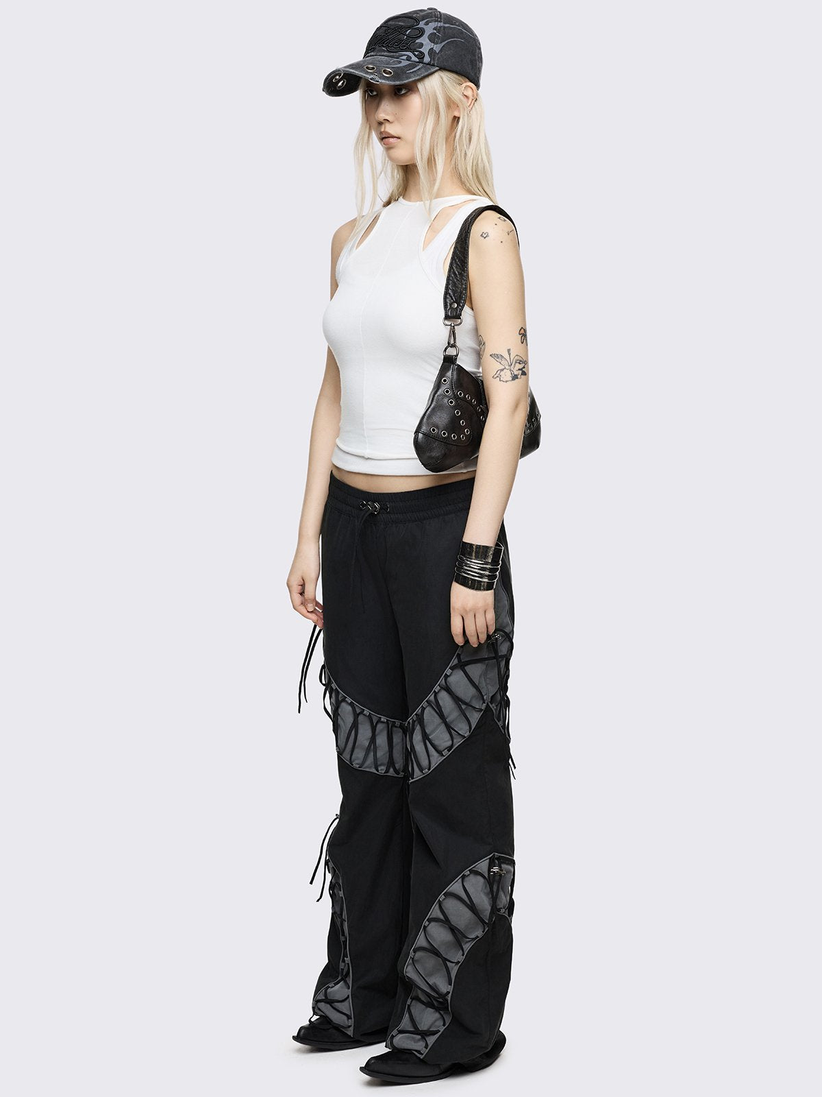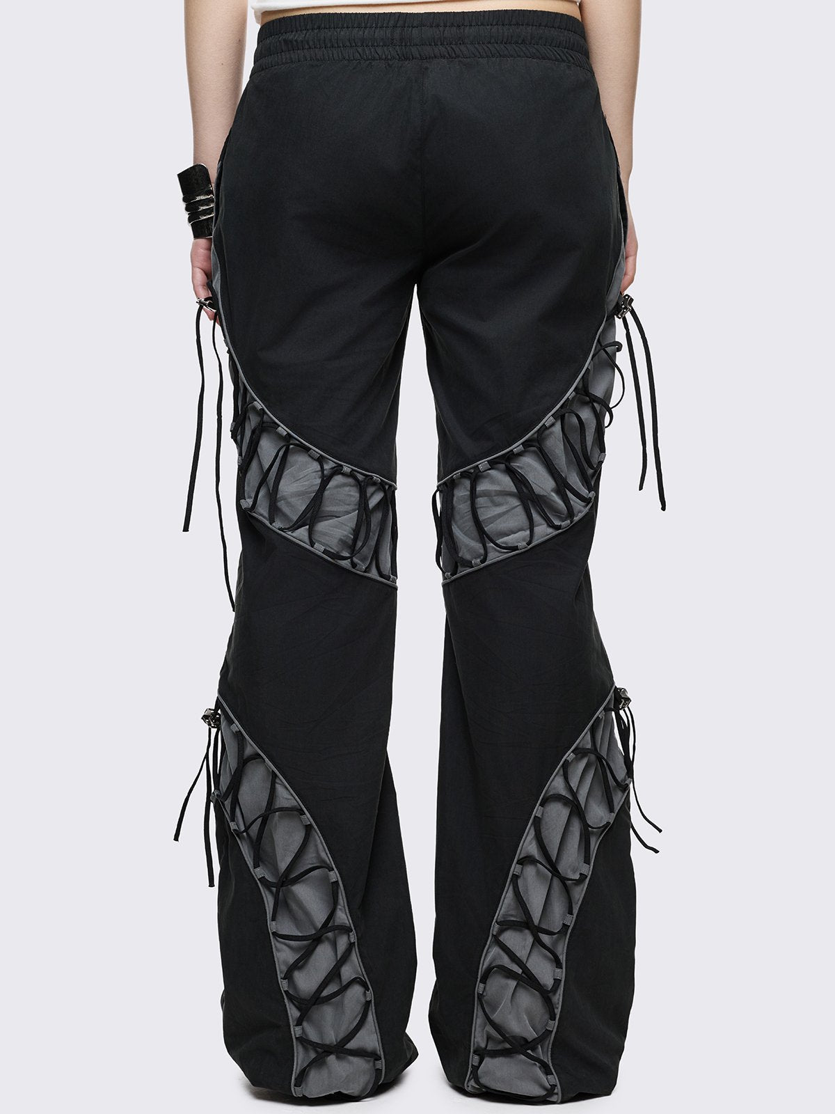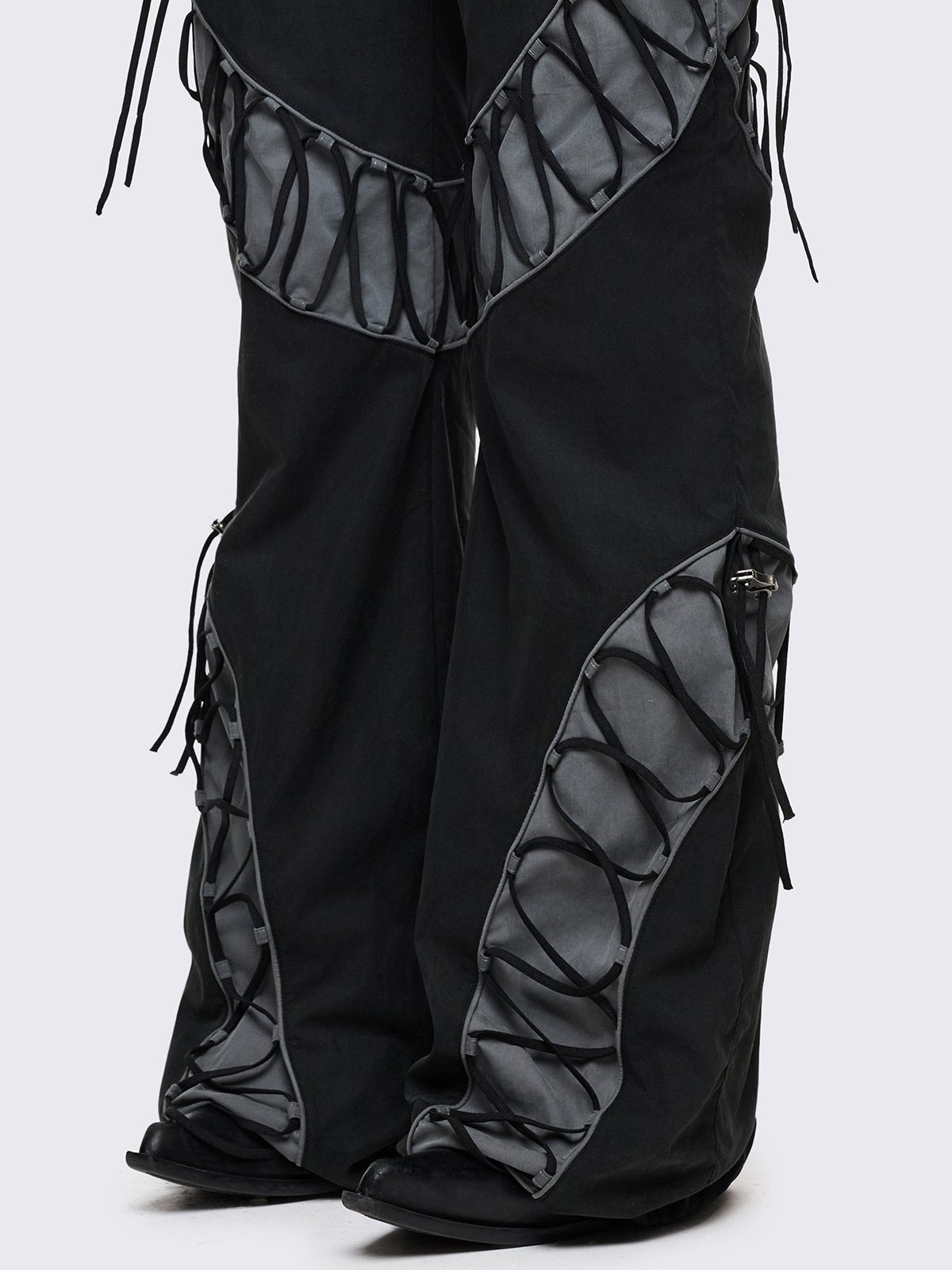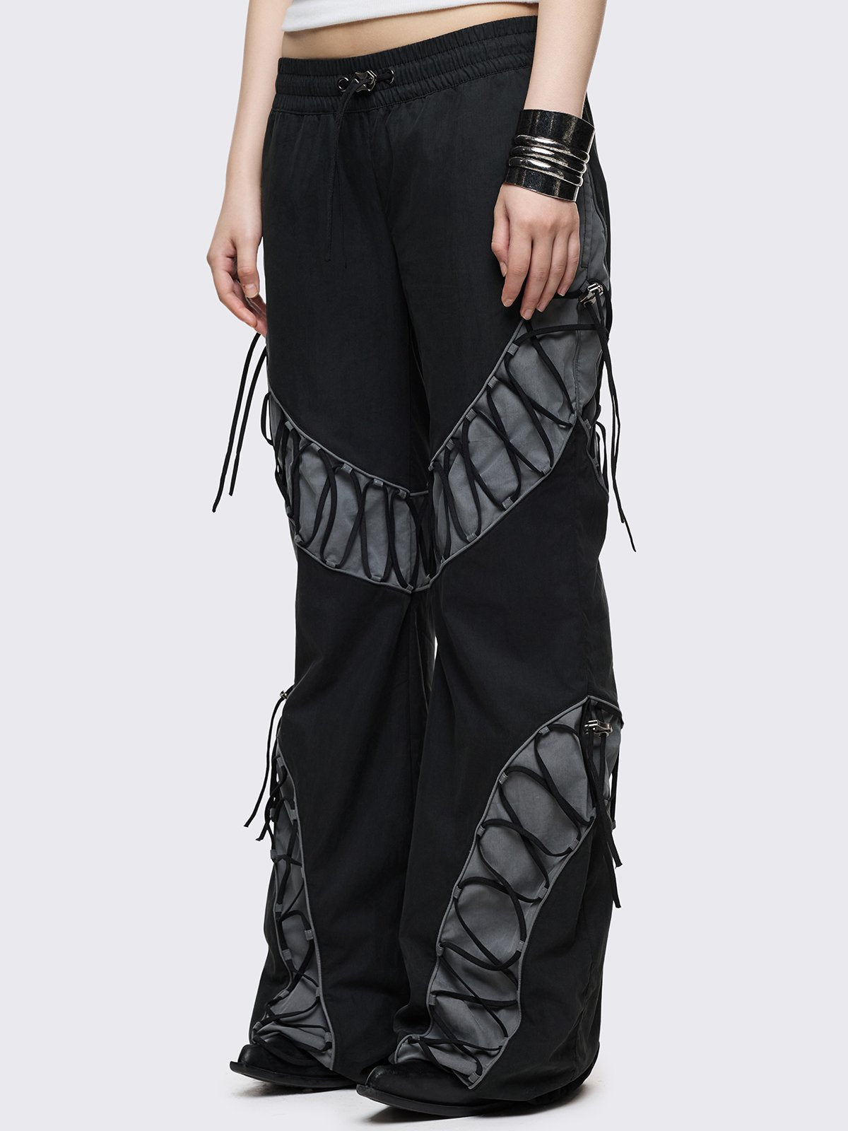 Black parachute baggy flared pants with grey panels with lace up.