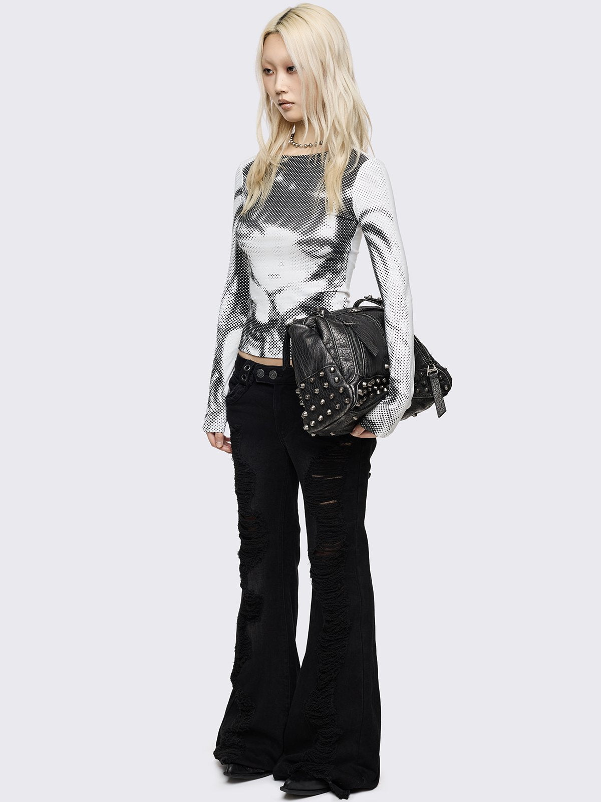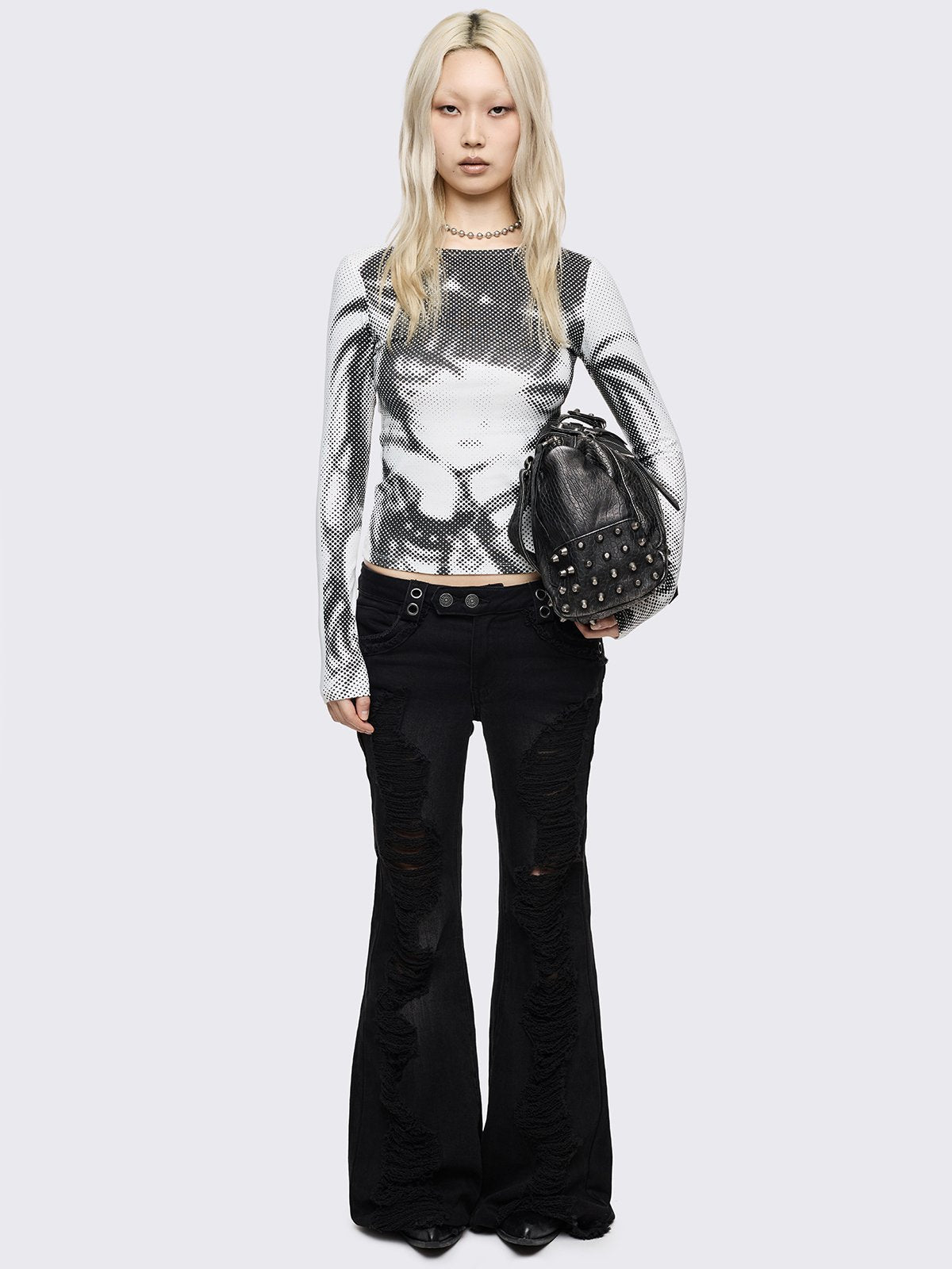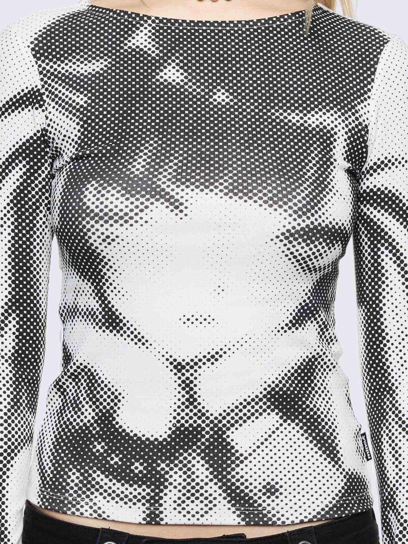 Off-white long sleeve top with pixel anime girl graphic print.
